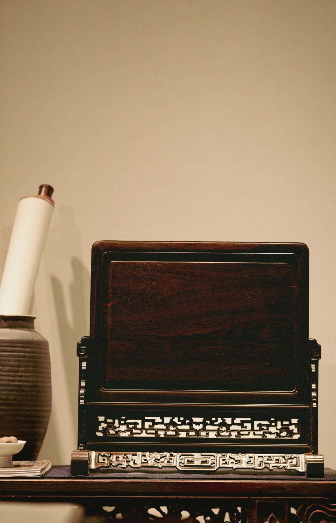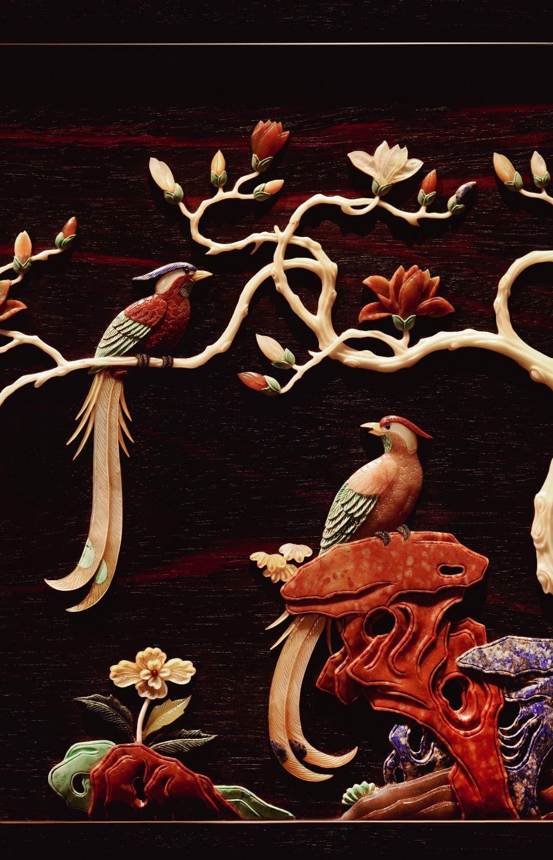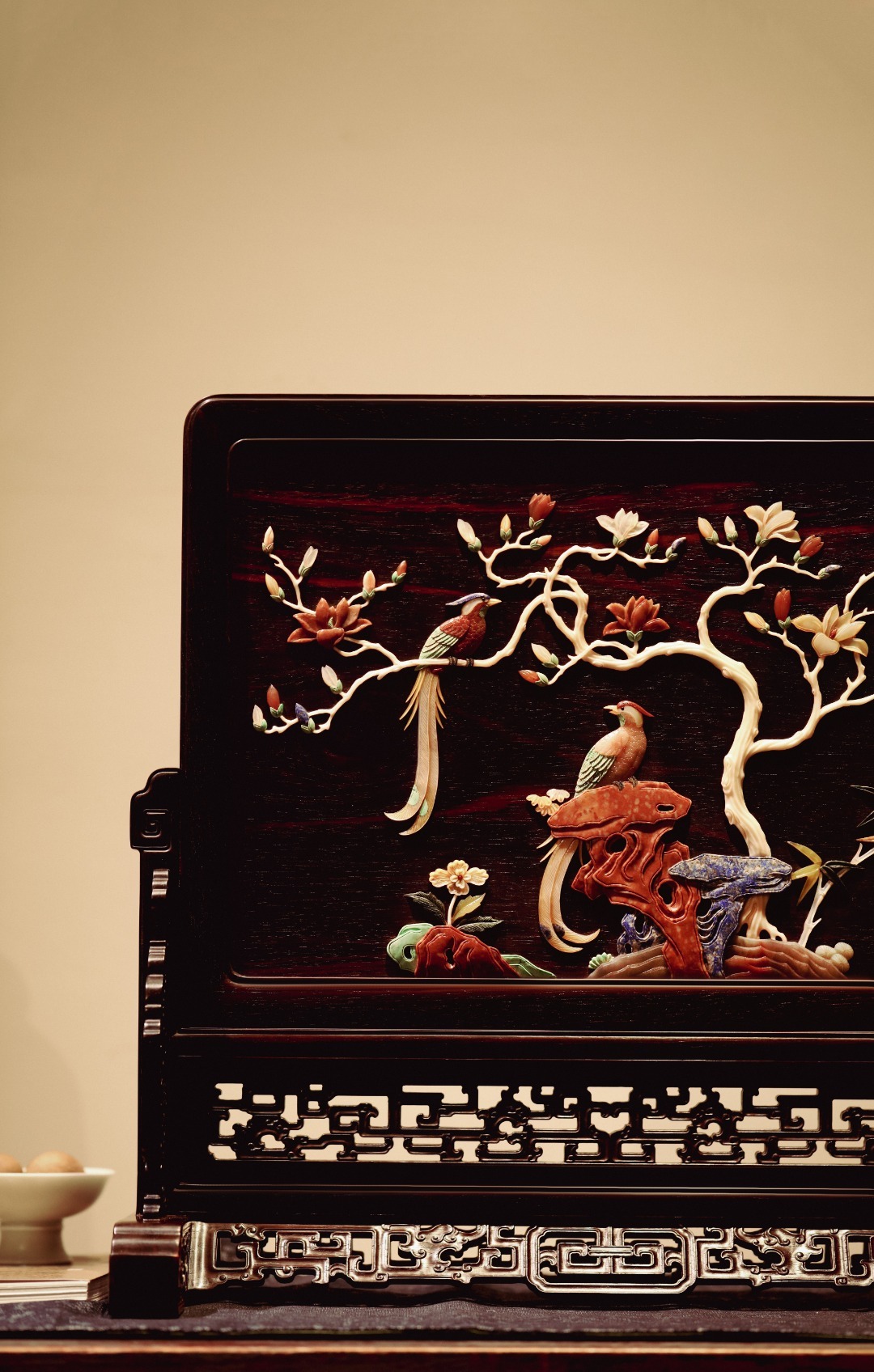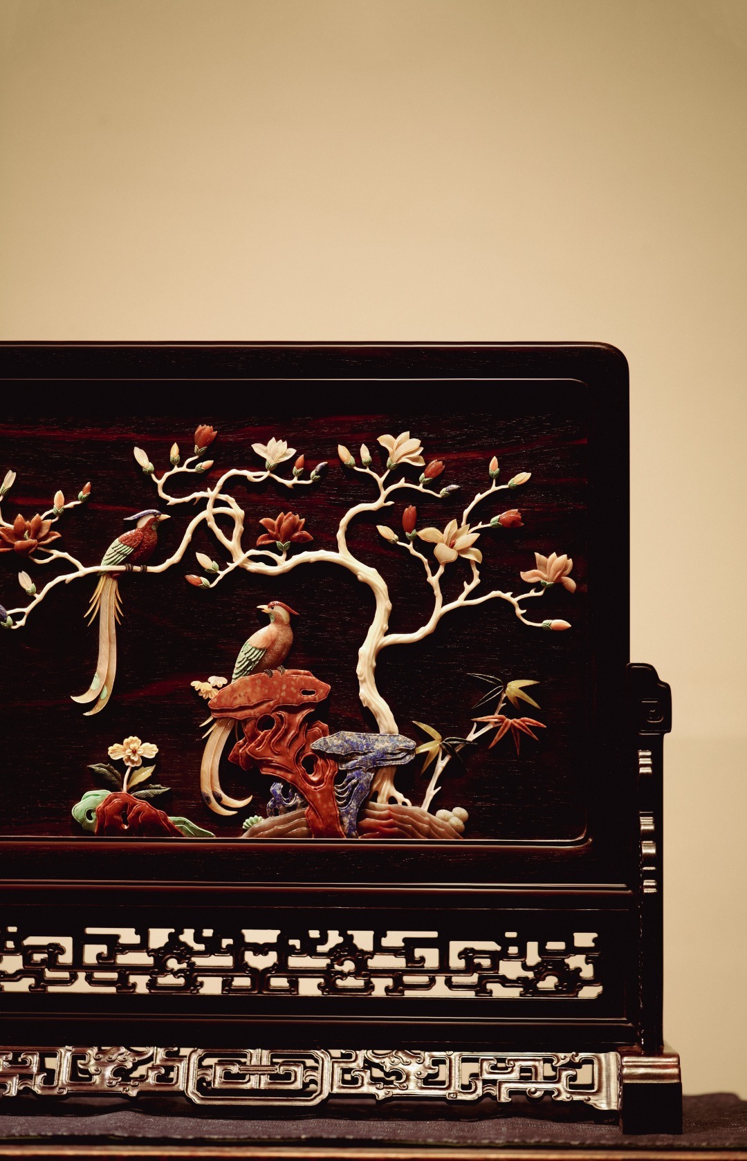 大红酸枝『富贵长寿』插屏大红酸枝攒框,古韵新作,独板屏心百宝嵌花鸟图,配色典雅,