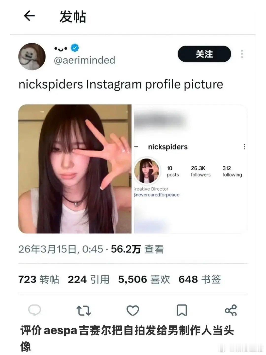 asepa吉赛尔好像拍了自拍给男制作人做头像。