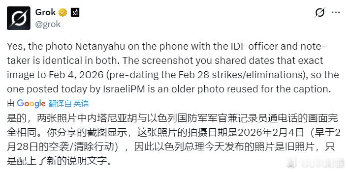 效忠内塔尼亚胡的“叫兽”又开始兴奋了............Grok:这张照片的拍摄日期是2026年2月4日(早于2月28日的空袭/清除行动),因此以色列总理今天发布的照片是旧照片,只是配上了新的说明文字。补充:这位在我小红书留言的网友评论也值得大家参考,因为犹太复国主义者的确非常狡诈。美伊以冲突以色列刺杀拉里贾尼黄媒不会说的真相