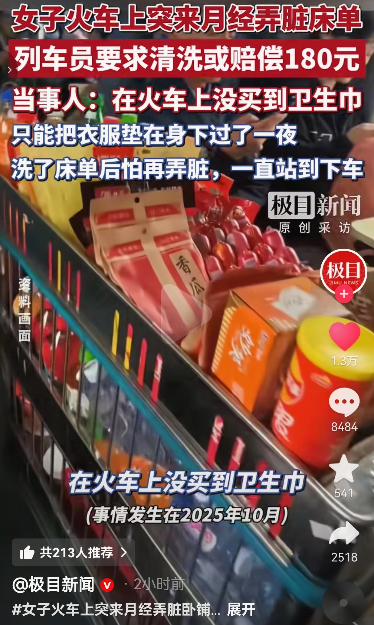 女子火车上突遇生理期弄脏床单,无奈站10多小时到站,这件事值得我们深思 去年10月,广东的张女士乘坐长途火车卧铺,半夜突然遭遇生理期到访。当时列车上的卫生巾已经售罄,深夜里也不便向其他乘客求助,她只能用自己的衣物垫在身下,小心翼翼地熬过了这一夜。 第二天清晨,她发现床单还是被弄脏了,列车工作人员告知她,按照规定需要自行清洗或者赔偿180元。 因为经济原因,张女士选择在列车洗漱池里仔细搓洗了床单,之后为了避免再次弄脏,她整整站了10多个小时直到下车,全程都充满了窘迫与难堪。 事后12306客服回应,列车上确实有售卖卫生巾,但可能存在售罄的情况;而关于弄脏床单的处理方式,也需要以列车现场工作人员的要求为准。 在事件引发关注后,涉事列车已经及时补充了卫生巾的售卖,希望能避免类似的困境再次发生。   网友们也纷纷表达了自己的看法,充满了共情与思考,有的网友说:“我也遇到过火车上没卫生巾的情况,真的特别无助,这真的是女性无法避免的生理需求。” 也有的网友说:“180元的赔偿确实有点高了,希望列车方面能更灵活地处理这类特殊情况,多给乘客一点理解。” 也有的网友说:“第一次听说让乘客自己洗床单的,公共服务确实应该多一些温度,少一些生硬的规定。” 还有的网友说:“太心疼这位女士了,生理期本来就难受,还要承受这么多压力,希望以后能有更完善的应急保障。” 其实这件事的核心,是公共服务如何面对乘客的特殊困境。 张女士的遭遇并非个人过失,而是在密闭空间里遇到的生理突发状况。180元的赔偿和自行清洗的要求,虽然是按规定执行,但也让本就窘迫的女性乘客承受了更多的压力与难堪。 铁路部门回应的“可能售罄”,也提醒我们:公共服务的完善,不能只停留在“有提供”,更要做到“不断供、有应急”。在女性刚需用品的保障上,多一份提前准备,就能少一份让乘客陷入无助的可能。  我们常说“人性化服务”,它从来不是一句口号,而是体现在每一个细节里:是在乘客遇到困难时多一句询问,是在特殊情况里多一份灵活处理,是把每一位乘客的真实需求放在心上。 女性的生理需求不是“麻烦”,而是需要被看见、被保障的基本权益。希望未来的公共出行里,能有更多温暖的预案,让每一位乘客都能更从容、更有尊严地踏上旅途。 最后,我想说的是: 服务的温度,藏在对每一个微小需求的看见里,愿每一段旅途都少一点窘迫,多一份从容。 对此,你怎么看?欢迎大家评论区讨论留言。