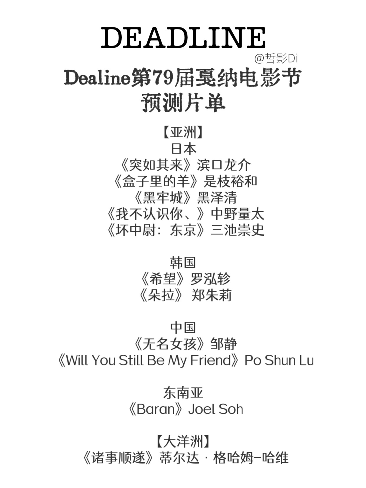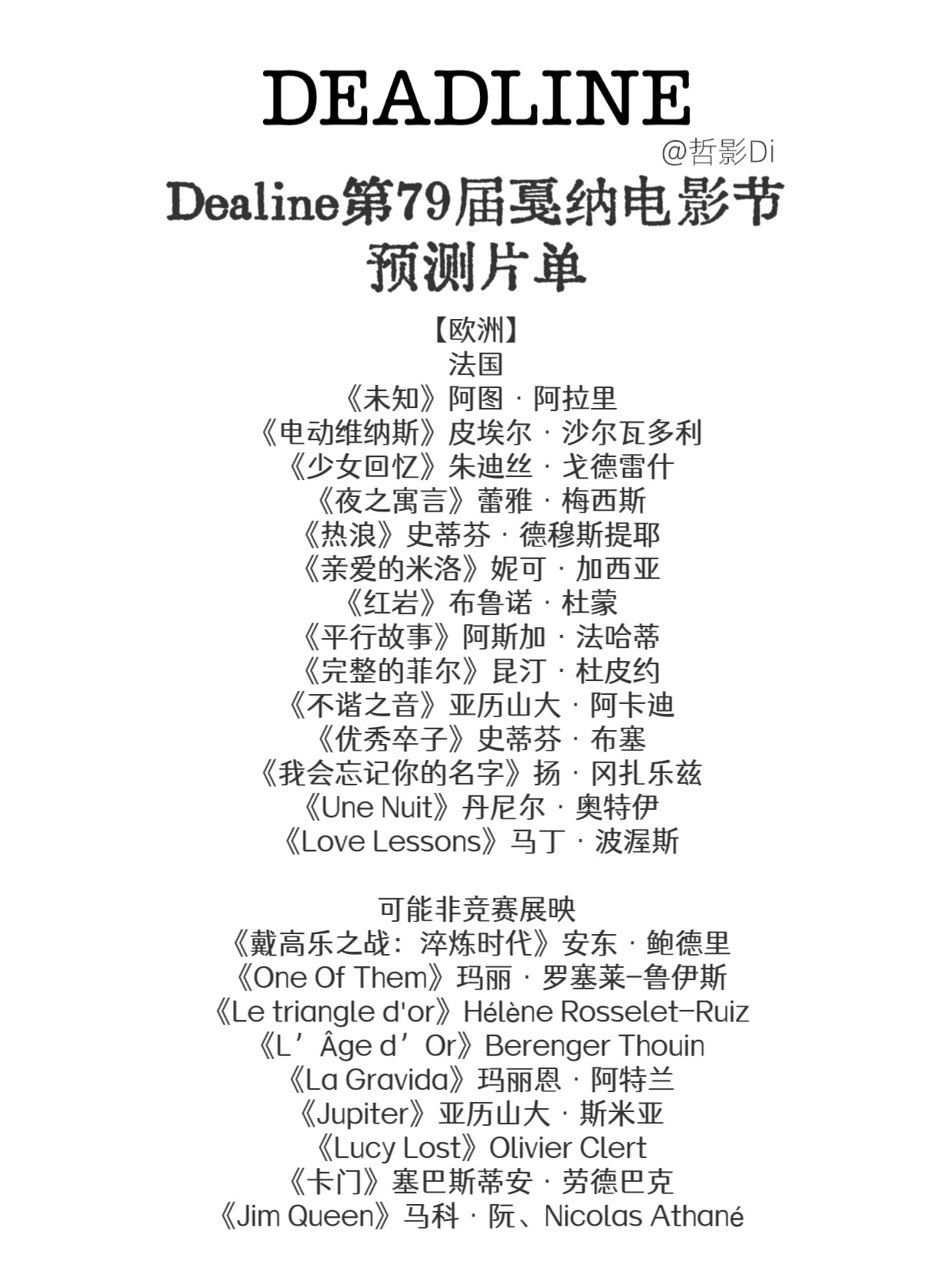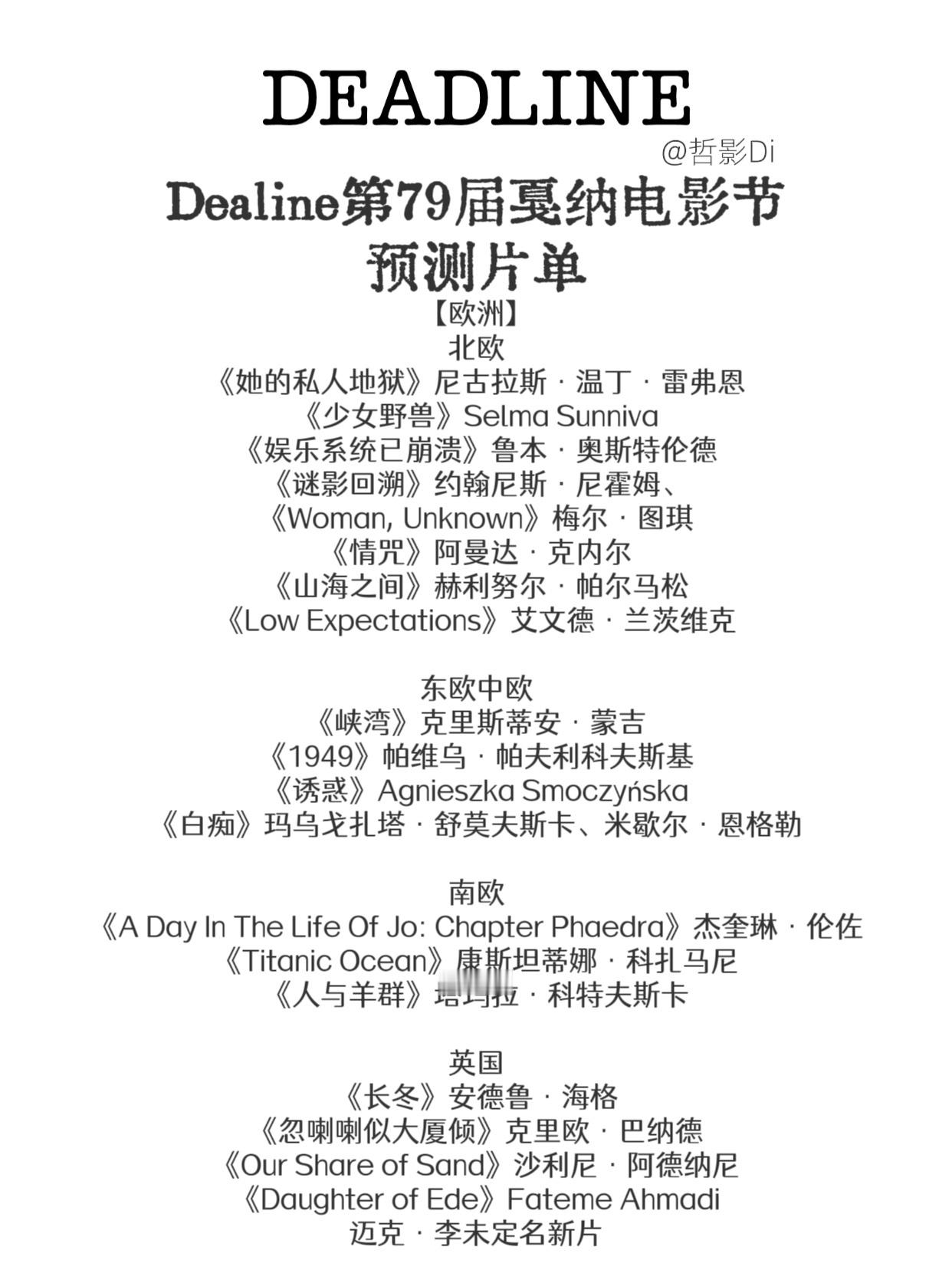 Deadline公布第79届戛纳电影节预测片单,中国导演邹静执导,李庚希、沈佳妮、祖峰主演的新片《无名女孩》出现在预测片单中。具体完整预测名单见图2-图6。