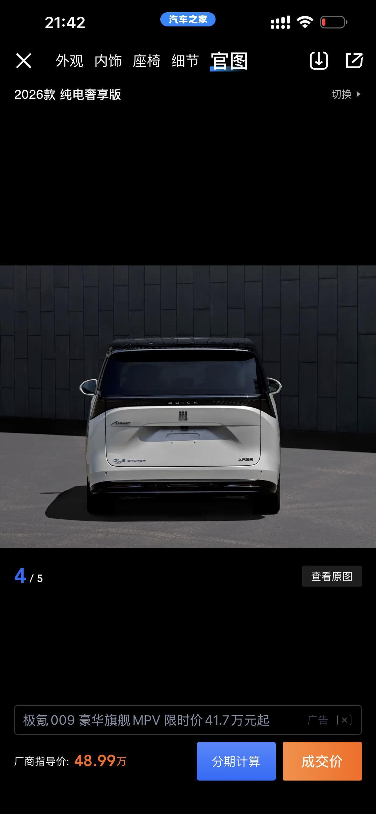 别克这款MPV上市 售价48.99万元 很多朋友都在关注别克新出的高端MPV,3月17日,上汽通用别克正式推出至境世家奢享版,官方定价48.99万元,只有一款配置,选择很简单。 它和家族里另一款车型最大的不同,是用了900伏高压平台+6C超充,官方数据显示,快充状态下10分钟就能补充相当可观的续航,对经常跑长途的家庭很友好。 外观是封闭式前脸,整体大气稳重,还提供专属的哑光灰双拼色,在路上辨识度不低。车身尺寸为5260/2023/1820毫米,轴距3160毫米,空间表现属于中大型MPV的主流水准。 车内有个很实用的点:它提供6座和7座两种布局,而同家族在售版本目前只有7座,对多孩家庭、商务接待都更灵活。 内饰用了高通8775芯片,多屏交互、语音控制、座椅加热通风按摩这些配置都配齐,二排舒适性突出,三排也有长距离电动滑轨,实用性拉满。 底盘配有空气悬架,上下车更方便;智能驾驶支持城市NOA,日常开起来更轻松。动力表现也够用,零百加速5.1秒,在MPV里属于轻快好开的类型。 同级别可以对比的车型有腾势D9 EV、极氪009等,定位都是中大型高端MPV。从市场反馈来看,这款车的家族版本2月销量1984辆,认可度还不错。 大家觉得这款48.99万的别克MPV,性价比怎么样?欢迎在评论区一起聊聊。 图片来源:别克官方