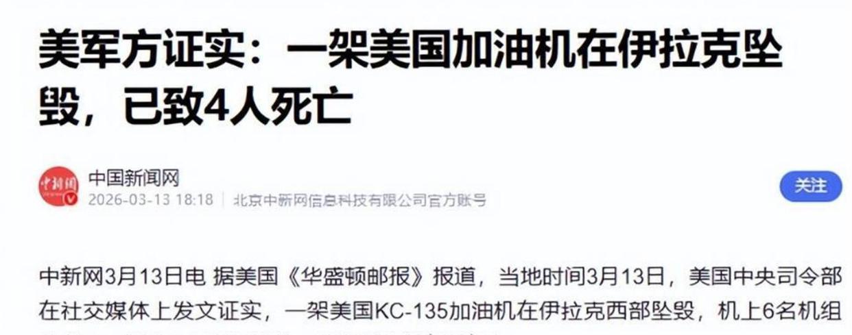 3月18日,据央视新闻直播间报道,当地时间3月17日,伊朗法尔斯通讯社称,一架受损美国加油机请求在以色列特拉维夫紧急降落,位于本古里安国际机场随即宣布进入到紧急状态。 评论,从2月28日美以对伊朗军事行动至今为止,已经有至少7架美国KC一135空军加油机受损或被摧毁,近日在伊拉克被伊拉克民兵组织击毁一架美国KC一135加油机,造成6名美军死亡。 这场侵略战争让美国付出惨重代价,这是美国总统特朗普咎由自取,活该啊![呲牙][呲牙][呲牙][呲牙][呲牙][呲牙][呲牙]