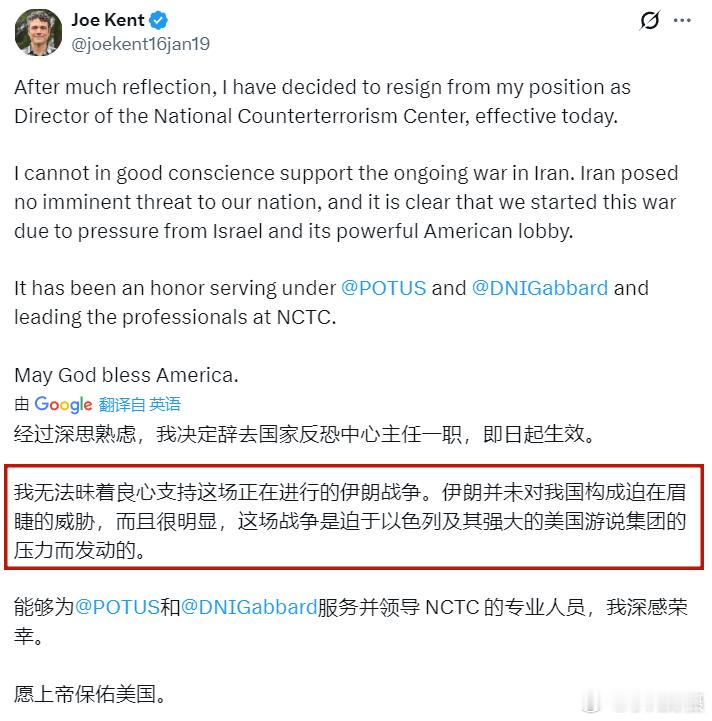 美反恐中心主任辞职 美国国家反恐中心主任肯特(Joe Kent)3月17日宣布因美国、以色列对伊朗的战争而辞职。他在社交媒体上传写给特朗普的辞职信,内容谈到“无法昧着良心支持正在进行的伊朗战争。”补充:美国国家反恐中心主任是美国联邦政府中的高级官员,其级别相当于美国行政体系中的“第2级”官员。与这一级别相当的其他职务包括中央情报局(CIA)局长、国家航空航天局(NASA)局长、环境保护署署长等。美伊以冲突伊朗的新战法让美国很头疼伊朗对美以发动58波打击黄媒不会说的真相