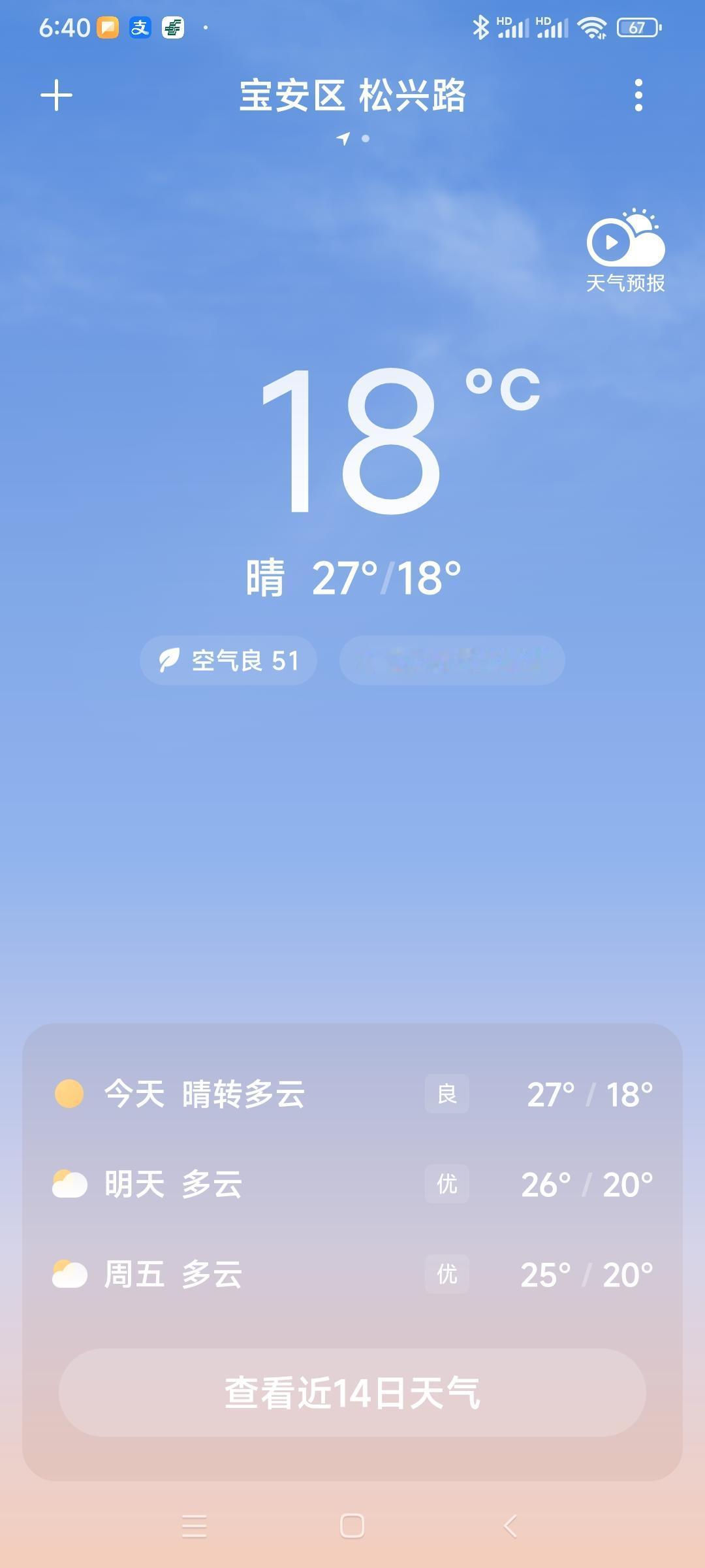 我的今日状态:😁轻松愉快 我这里的天气:☀️晴天深圳今日晴转多云,气温18度到