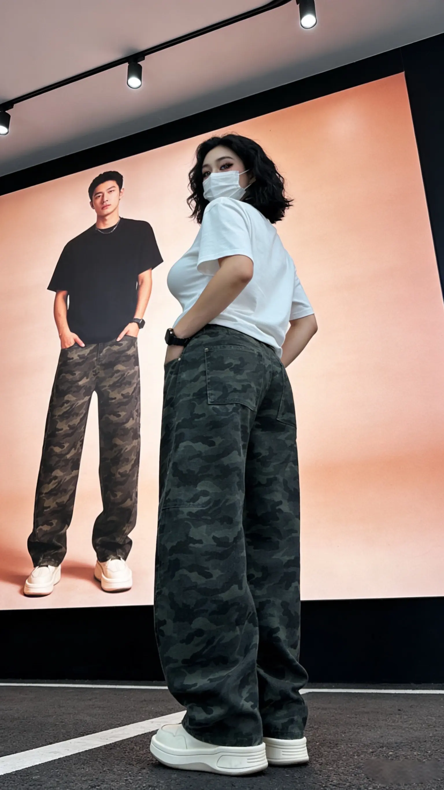 美式伐木迷彩牛仔裤男女弯秋款工装裤子高街vibe微喇裤