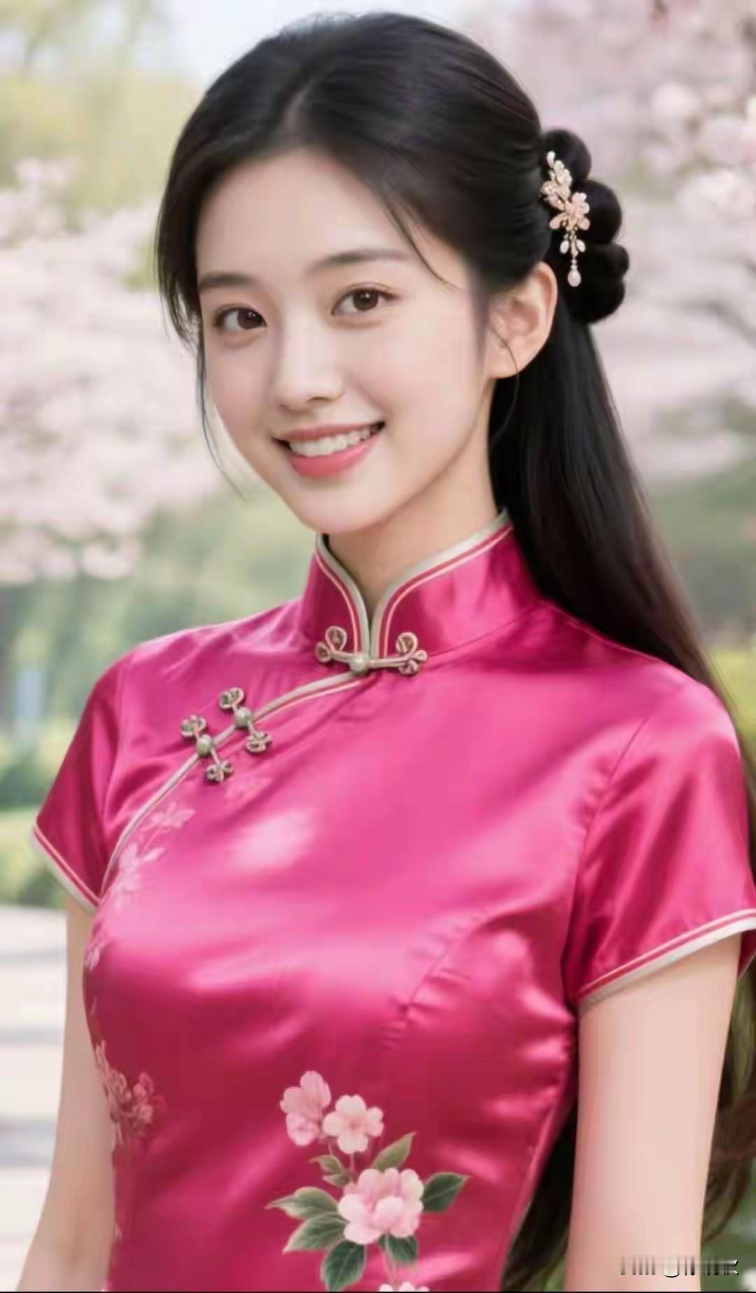 回眸一笑百媚生,恰似春风拂柳轻。旗袍雅致韵味浓,紫色牡丹沾风情。