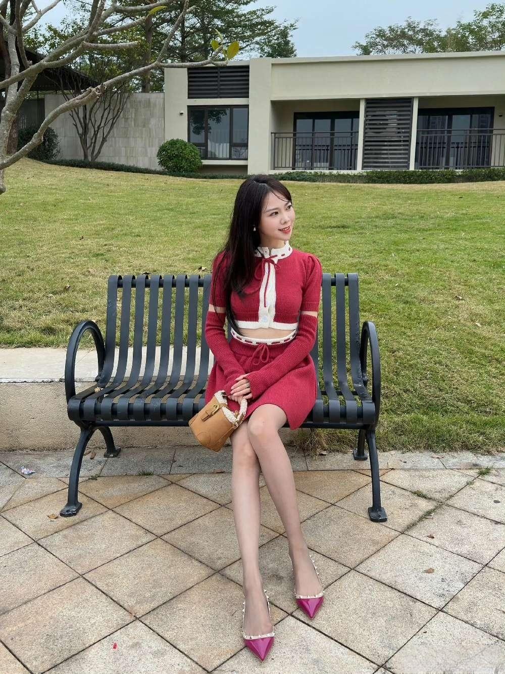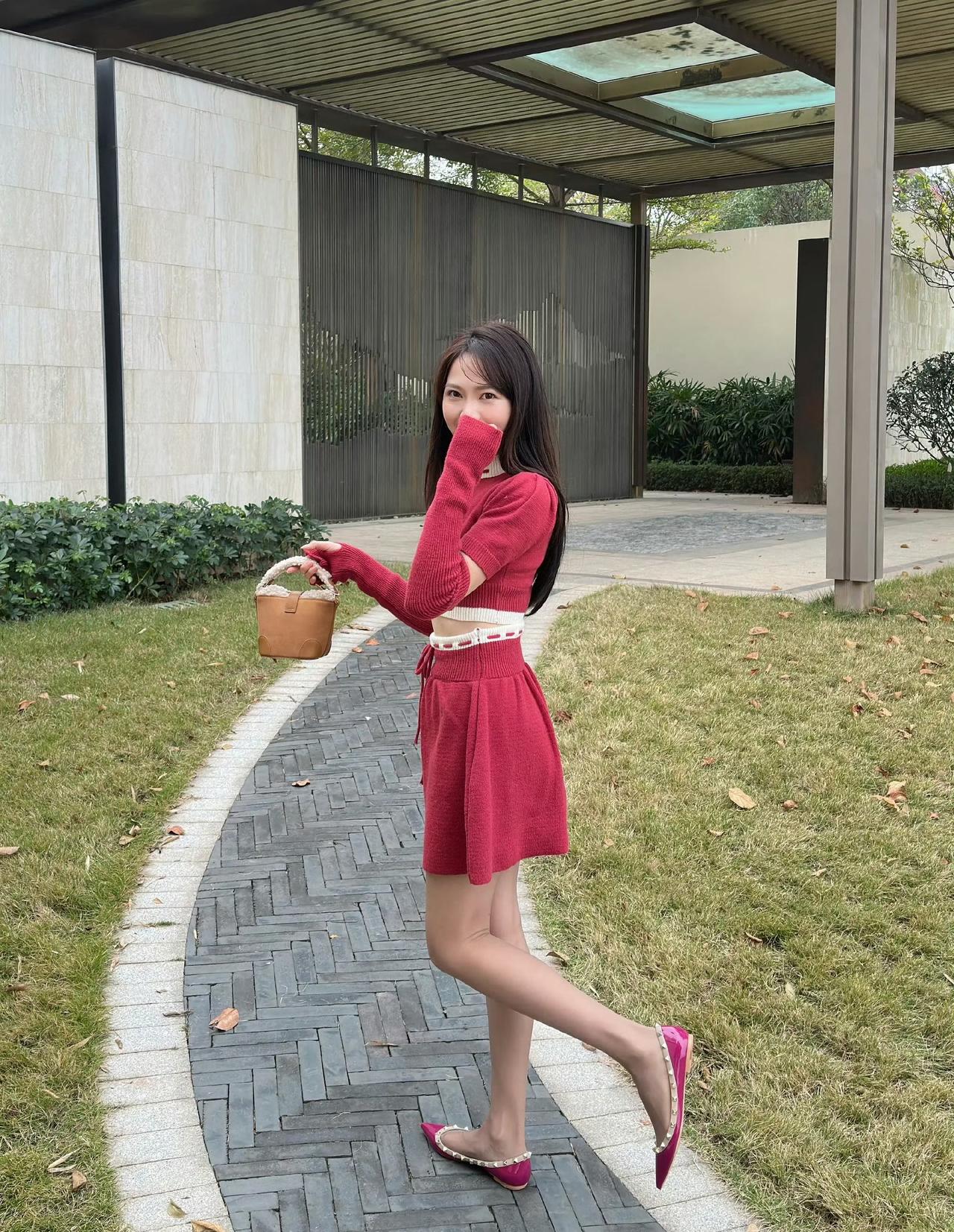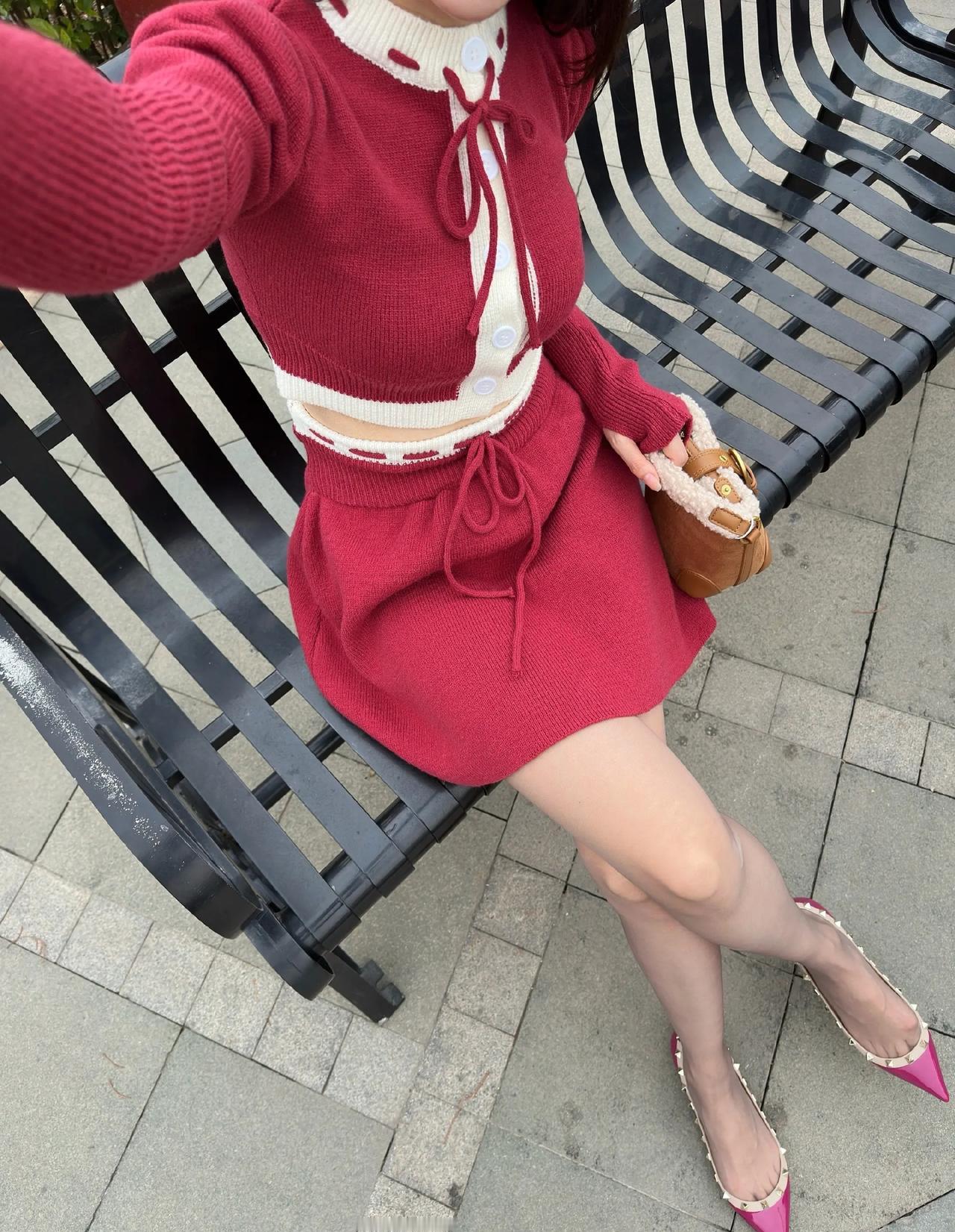 这套是甜酷复古少女风,核心是红白金边针织套装:镂空袖+短款设计自带甜酷少女感,金边装饰增加复古精致细节,浅肤色袜+玫红尖头鞋强化了亮眼氛围,搭配复古小包,整体甜而有个性。针织感穿搭 针织套装搭配 玫粉针织套装