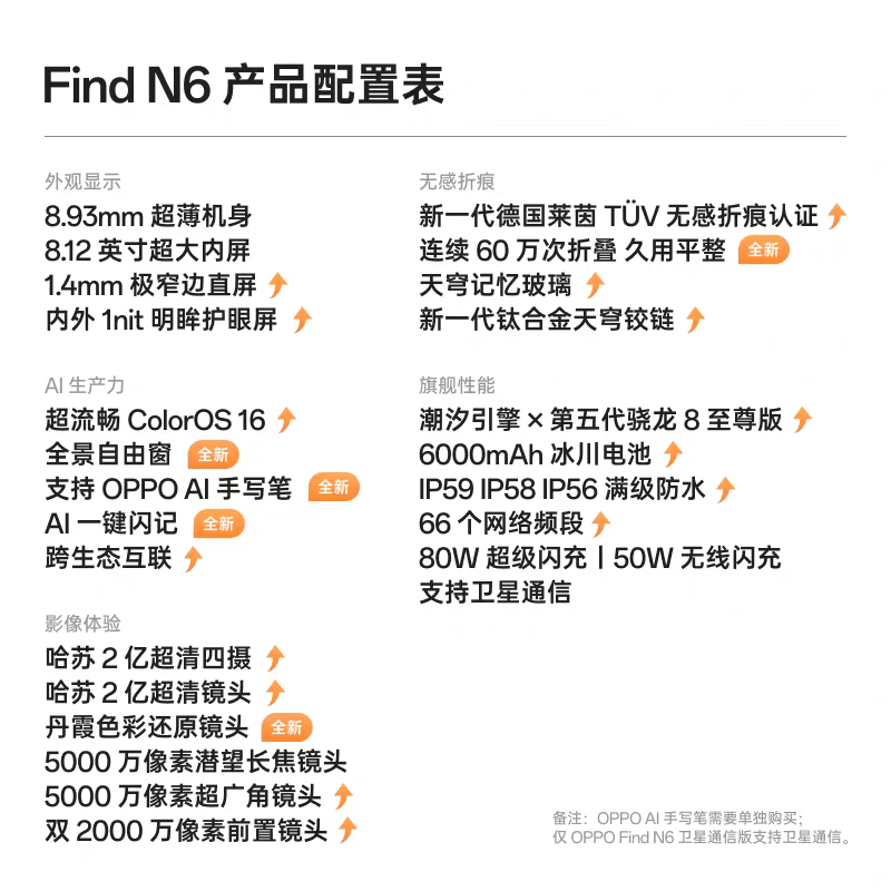 5.其他:ColorOS 16,全景自由窗,侧边指纹支持 AI 手写笔,新一代山海通信,钛合金四转轴/钛合金3D打印翼板,IP56、58、59等级防水,USB 3.2 Gen1、WiFi 7,金橙、原钛、深黑配色三色,12G+256GB 9999元起! OPPO