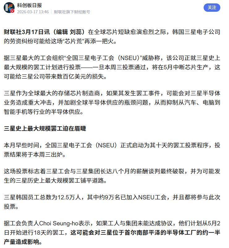 什么?存储芯片供应即将暴雷! 据媒体报道,在全球内存短缺潮的背景下,作为核心供应商之一的三星正面临罢工威胁。 具体而言,“全国三星电子工会(NSEU)”表示自己正在进行罢工投票。倘若结果通过,这场三星史上最大规模的罢工计划将会中断三星的芯片生产计划。这不仅会给三星本身带来数百亿美元的损失,还会让全球本就短缺的储存芯片变得更为稀缺。