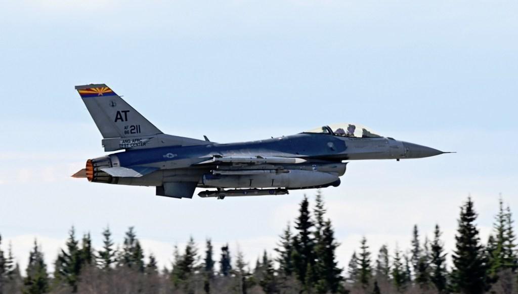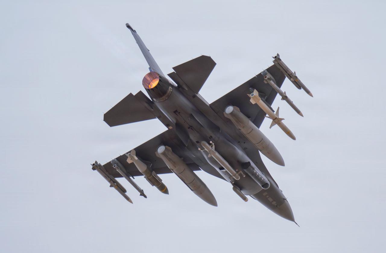 美伊侵略伊朗战争中,美制F-16战斗机满载出击,翼下挂着一枚JDAM精确制导炸弹