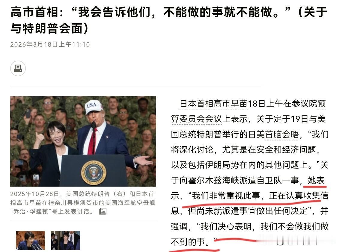 赶在访美之前,高市早苗竟然对美国说了硬话!3月18日,根据日本媒体报道,19日,高市早苗即将动身前往美国访问,而在18日上午在参议院预算委员会会议上日本首相高市早苗表示,关于定于19日与美国总统特朗普举行的日美首脑会晤,我们将深化讨论,尤其是在安全和经济问题,以及包括伊朗局势在内的其他问题上。 关于向霍尔木兹海峡派遣自卫队一事,我们非常重视此事,正在认真收集信息,但尚未就派遣事宜做出任何决定。我们决心表明,我们不会做我们做不到的事。很显然,高市早苗这一句“我们决心表明,我们不会做我们做不到的事”,这无疑是把美国的施压给硬顶了回去。 高市早苗这一番硬气表态,这无疑是非常不给特朗普面子。当然,高市早苗的硬气,这说明日本把账给算清楚了,知道派兵兹事体大,日本绝对不应该趟这一趟浑水。但问题是,高市早苗不怕美国报复吗?高市早苗当然是害怕。问题是,这个死结日本如何解决呢? 如果高市早苗以这种强硬姿态访美,恐怕特朗普根本不会让高市早苗来。因此,虽然高市早苗表态强硬,但极有可能日本会在其它问题上对美国大让步,以此作为交换。毕竟,“我们不会做我们做不到的事”的反面就是我们在能够做到的领域,可以做到极致。因此,日本怕是已经想好了补偿美国的办法。
