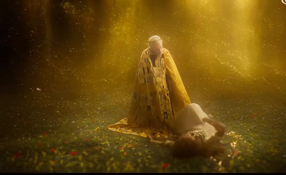 周杰伦新预告,有点说法,诡异像是AI跑出来的东西。 明明是致敬克里姆特的传世名画《吻》,原作里满是鎏金的浪漫与缱绻。 到了这个预告里,只剩一股子说不出的阴森违和感。 金灿灿的光影只仿到了皮毛,可人物的脸、肢体全透着AI特有的“似是而非”的怪。 五官糊成一团,动作僵硬得不像活人,连拥抱的姿态都透着一股没灵魂的机械感,完美踩中了恐怖谷效应,越看越渗人。