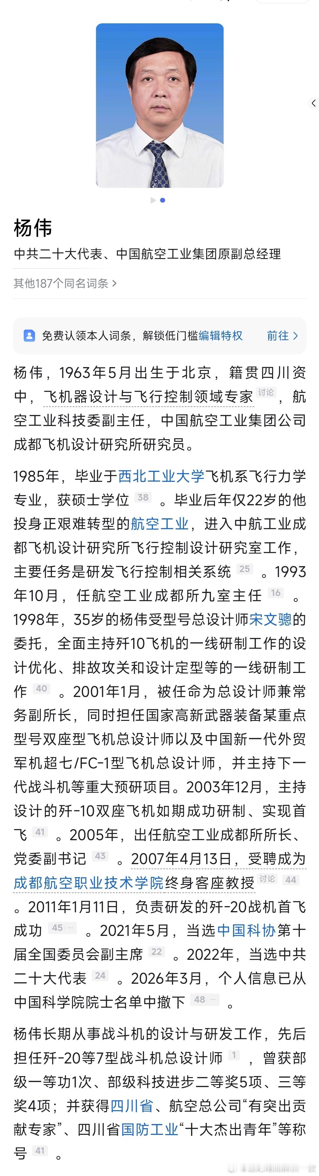 中国科学院撤下歼-20总设计师杨伟院士简历。