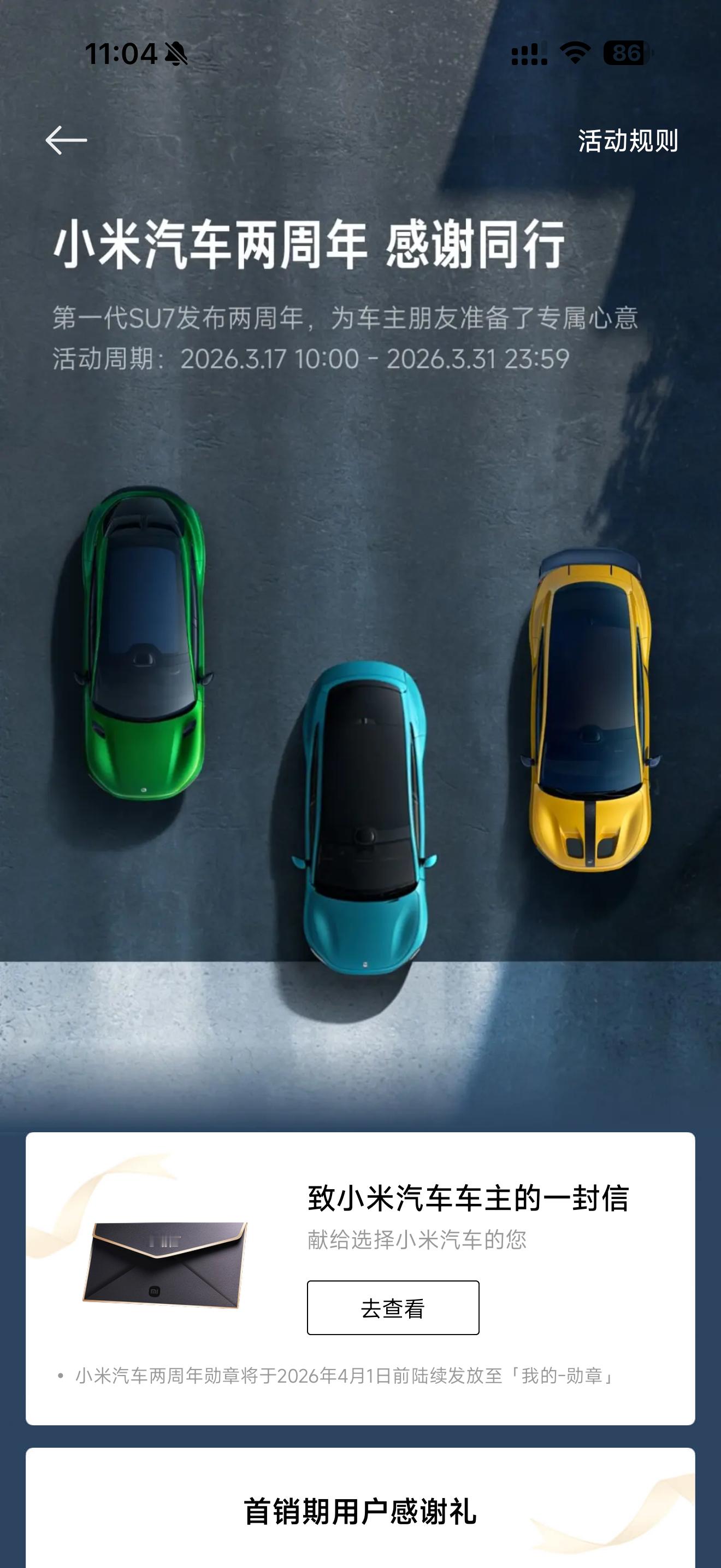 小米汽车App里有两周年车主礼物可以领啦,可以免费领一个冰箱贴