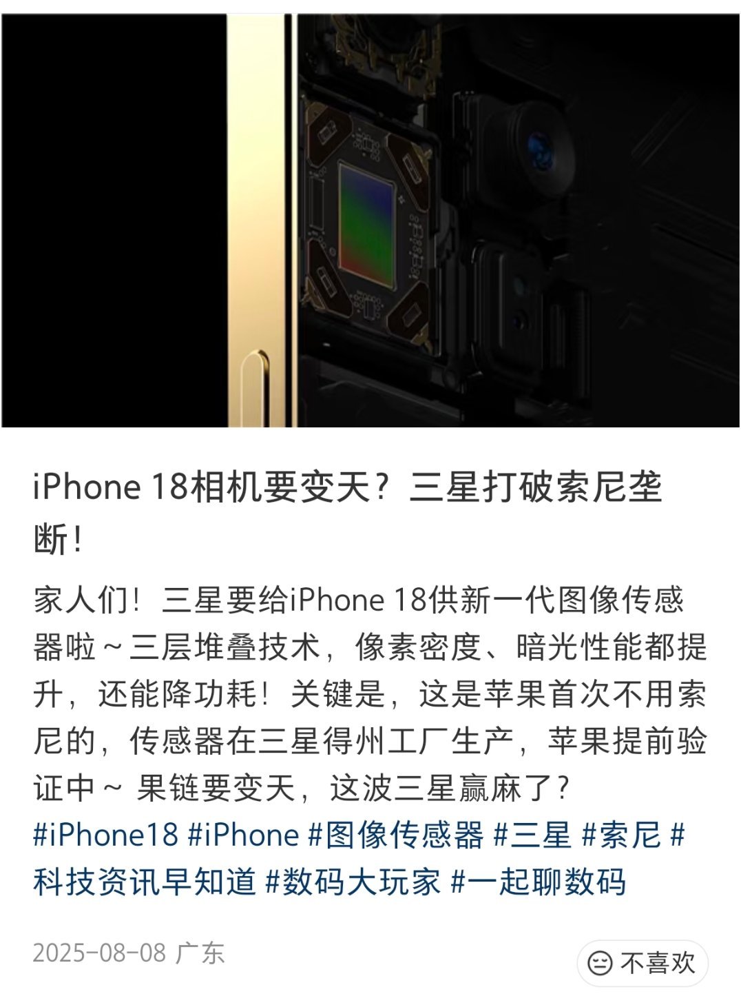 iPhone18将首次启用三星相机去年就传出来三星要给iPhone 18供新一代图像传感器啦,定制三层堆叠技术传感器!现在没想要真的应验了!看来早有预兆啊,不知道索尼作何感想~