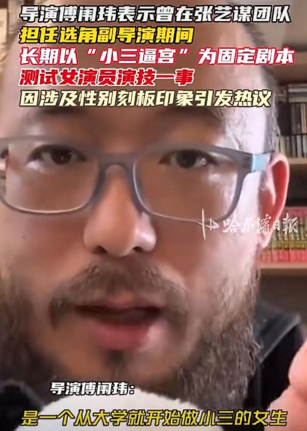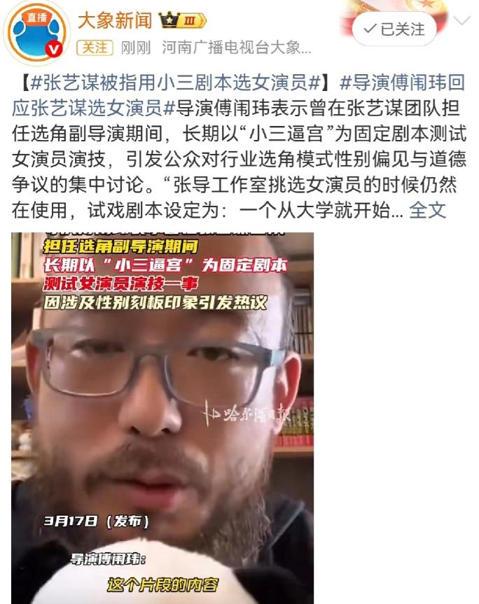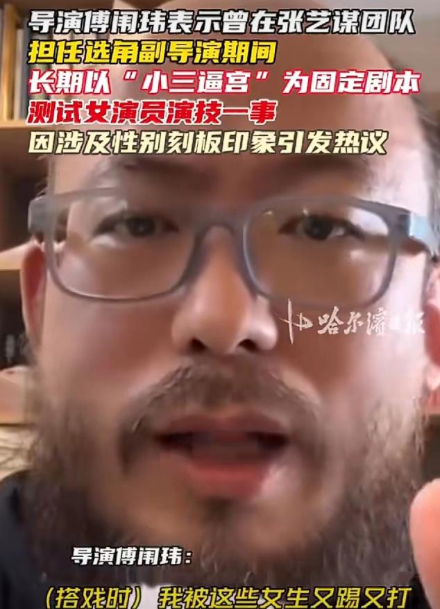 张艺谋,冲上热搜! 3月17日下午,张艺谋突然冲上了热搜,这一次不是啥好事,而是导演傅闱玮的爆料,把张艺谋团队的选角流程推上了风口浪尖。   傅闱玮不是什么圈外蹭热度的路人,在选角领域摸爬滚打多年的他,早已是业内资深人士,更曾担任《金陵十三钗》的选角副导演,亲身参与过张艺谋团队的核心选角工作。   他手里握着的,是最真实的一线执行经历,这份底气,让他的爆料绝非空穴来风,也不是为了博眼球而编造的谎言。   据了解,傅闱玮一开始只是在网上和网友随便聊聊圈内选角的小趣事,可聊着聊着,便忍不住说出了当年在张艺谋工作室的亲身经历,那些被刻意隐藏的选角细节,一点点被揭开,每一个都让人倍感震惊。   在大众印象里,张艺谋是“电影鬼才”,是能发掘出无数优秀演员的伯乐,可谁能想到,他的团队在选角时,竟然有着一套固定到刻板、且充满争议的测试模式。   不管来试镜的女演员是科班出身的专业演员,还是毫无经验的素人,不管她们想争取的是正面角色还是反面角色,只要想踏入张艺谋团队的大门,就必须先闯过“小三逼宫”这一关,没有任何通融的余地。   这套看似奇葩的测试流程,傅闱玮亲手经手过上千人,而他自己,更是在其中反复扮演“渣男”,日复一日地重复着同样的对手戏,次数多到自己都记不清。   这套测试的剧本,说起来简单,却透着一股刺眼的不适感:一个从大学时期就介入他人感情的第三者,拿着孕检报告,不顾一切地逼迫男方离婚,只为成功上位。   试戏过程中,傅闱玮要亲自和女演员搭戏,一边用最刻薄、最伤人的话刺激对方,比如“你本来就是个外人,我不可能离婚”“你肚子里的孩子,跟我没有半点关系”,一边还要承受女演员因情绪爆发而做出的踢打、泼水、撕衣服,甚至是踹肚子等肢体冲突。   更让人无法接受的是,这场测试的合格标准,竟然是要把试戏的女演员逼到哭,以此来判断她们的情感爆发力够不够强。   就连被张艺谋一手捧红的“谋女郎”刘浩存,当年也没能逃过这套争议测试。   试镜《一秒钟》的时候,刘浩存才16岁,还是个懵懂无知的未成年人,没有任何表演经验,纯粹是个刚踏入这个行业的新人。   当时的她,被要求演绎这段“小三逼宫”的片段,青涩的她扎着简单的马尾,一遍又一遍地追问对手戏演员“为什么不能离婚”,语气里满是委屈和绝望。   当对方说出那些刻薄的拒绝话语时,她的眼泪瞬间夺眶而出,那种崩溃的情绪不是刻意演出来的,而是发自内心的,也正是这份表现,让她被张艺谋团队看中,获得了踏入演艺圈的机会。   只是那时候,没人会去深究这段试戏片段背后的争议,只当是一次普通的演技测试。   傅闱玮的爆料一经发出,立刻在网上引发了轩然大波,舆论瞬间被点燃。   可让人没想到的是,爆料没过多久,傅闱玮就悄悄删除了相关的爆料视频,还在评论区回复网友“收到通知,低调点”。   这种看似妥协的操作,不仅没有平息争议,反而让网友的好奇心被彻底勾了起来,大家纷纷猜测,傅闱玮是不是受到了某种压力,这场爆料背后,还有没有更多没被说出来的隐情。   一时间,关于张艺谋团队选角的讨论,在网上愈演愈烈,热度丝毫没有减退。   随着话题的发酵,网友们的观点也逐渐分成了两派。   有一部分人觉得,这种测试方式虽然有争议,但确实是最便捷、最高效的,能快速看出一个演员的情感爆发力,毕竟演技好不好,关键时刻的情绪输出最能说明问题。   但更多的人,却对这种方式提出了强烈的质疑:测试演技的方法有那么多,亲人分离的不舍、梦想破碎的绝望、被人误解的委屈,任何一种情节,都比“小三逼宫”这种充满负面导向、带着性别刻板印象的情节更合适。   尤其是对于未成年演员来说,长期接触这种负面内容,很容易给她们的心理造成负担,这本身就是对演员的不尊重,更是一种不负责任的表现。   其实,影视行业里,类似的选角争议并不是第一次出现。   之前就有爆料称,某古装剧组在选角时,要求女演员穿着过于暴露的服装试戏,还美其名曰“贴合角色设定”,实则是对女性演员的不尊重,完全忽视了演员的感受。   这件事被网友曝光后,引发了大量不满,最终剧组迫于舆论压力,不得不公开道歉,并对选角流程进行整改。   作为国内顶级导演,张艺谋的一举一动,都在影响着整个影视行业的风向。   他的团队采用这样充满争议的选角方式,不仅消耗着演员的热情和灵气,更给整个行业树立了一个不良的榜样。   我们不反对对演员的演技有高标准、严要求,但高标准绝不等于用争议情节绑架演员,更不等于忽视对演员的尊重和保护。   这场热搜,从来都不只是一次简单的圈内爆料,它更像是一次警示,照出了影视行业选角背后那些不为人知的潜规则。   希望这场舆论风暴,能让更多的行业从业者清醒过来,放弃那些充满刻板印象、不尊重演员的选角方式,用更人性化、更多元化的标准去选拔人才,只有这样,影视行业才能真正健康、长久地发展下去。