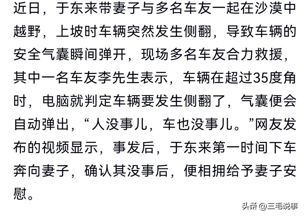 于东来真是个好男人啊。 近日,于东来沙漠越野时车辆侧翻,车友合力救援,其实也没什么事情,毕竟是在沙漠里,当时车辆倾斜超过35度角,这电脑就自动判定为翻车,所以这气囊就自动弹出了。 这真的是很智能的一个设计。 于东来下车后飞奔去向妻子所在的车,给了妻子一个紧紧的拥抱。 看得出来两人感情非常的深厚。 于东来已经开始游历祖国的大好河山了。经常看到他游玩的视频。 这才叫人生。