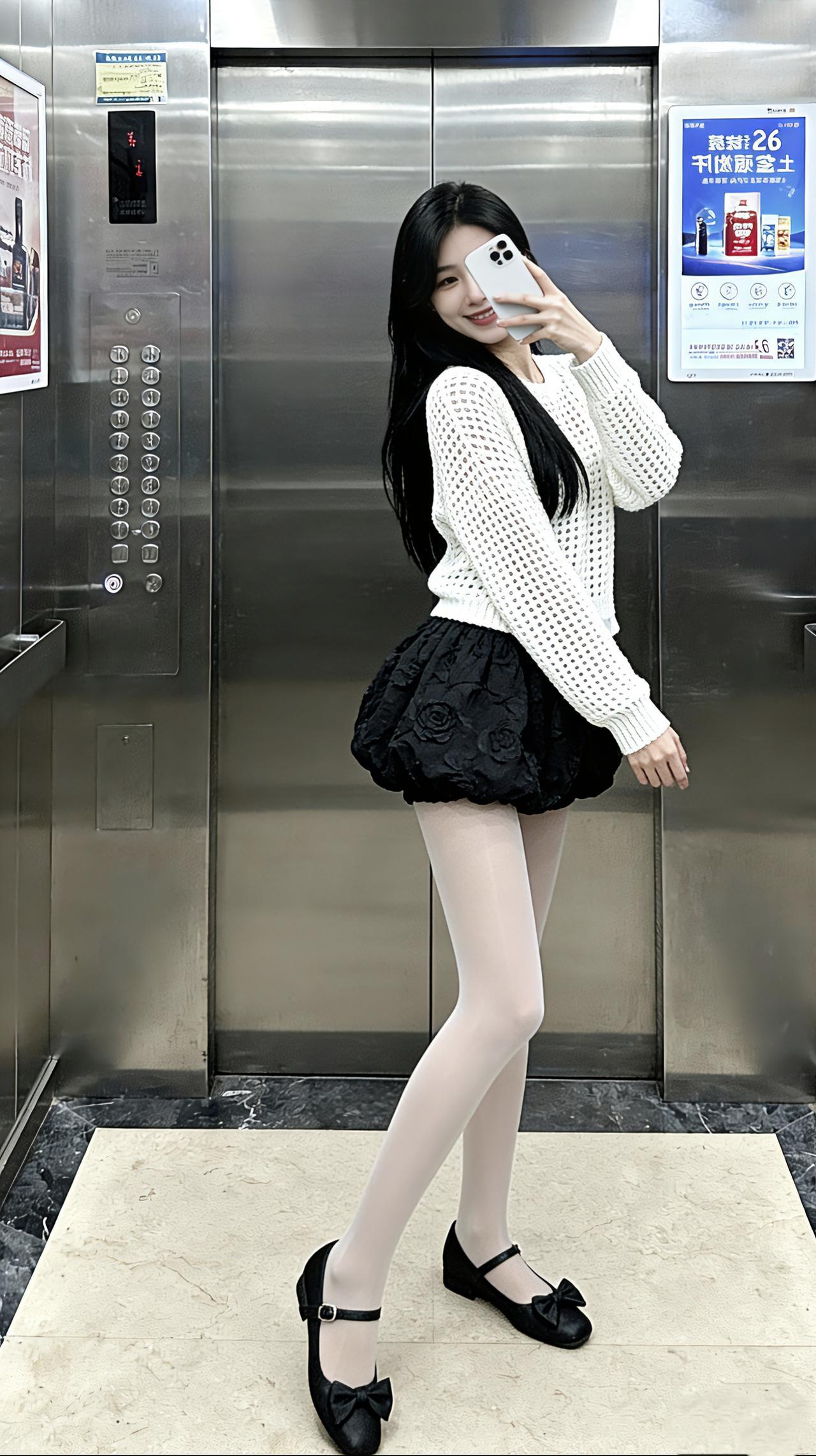 甜妹赴春光!电梯间里,奶白镂空针织裹着软乎乎的甜,黑花苞裙一摆又仙得像小裙子~蝴