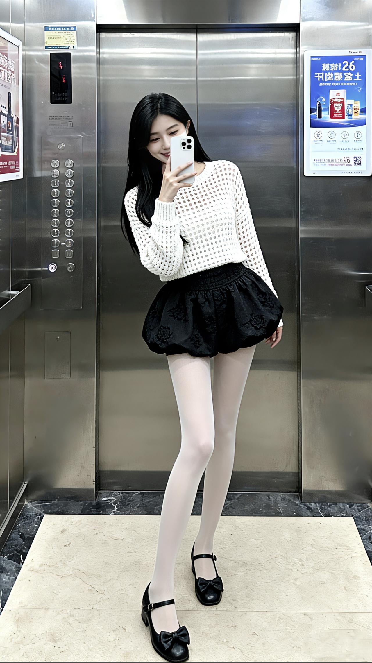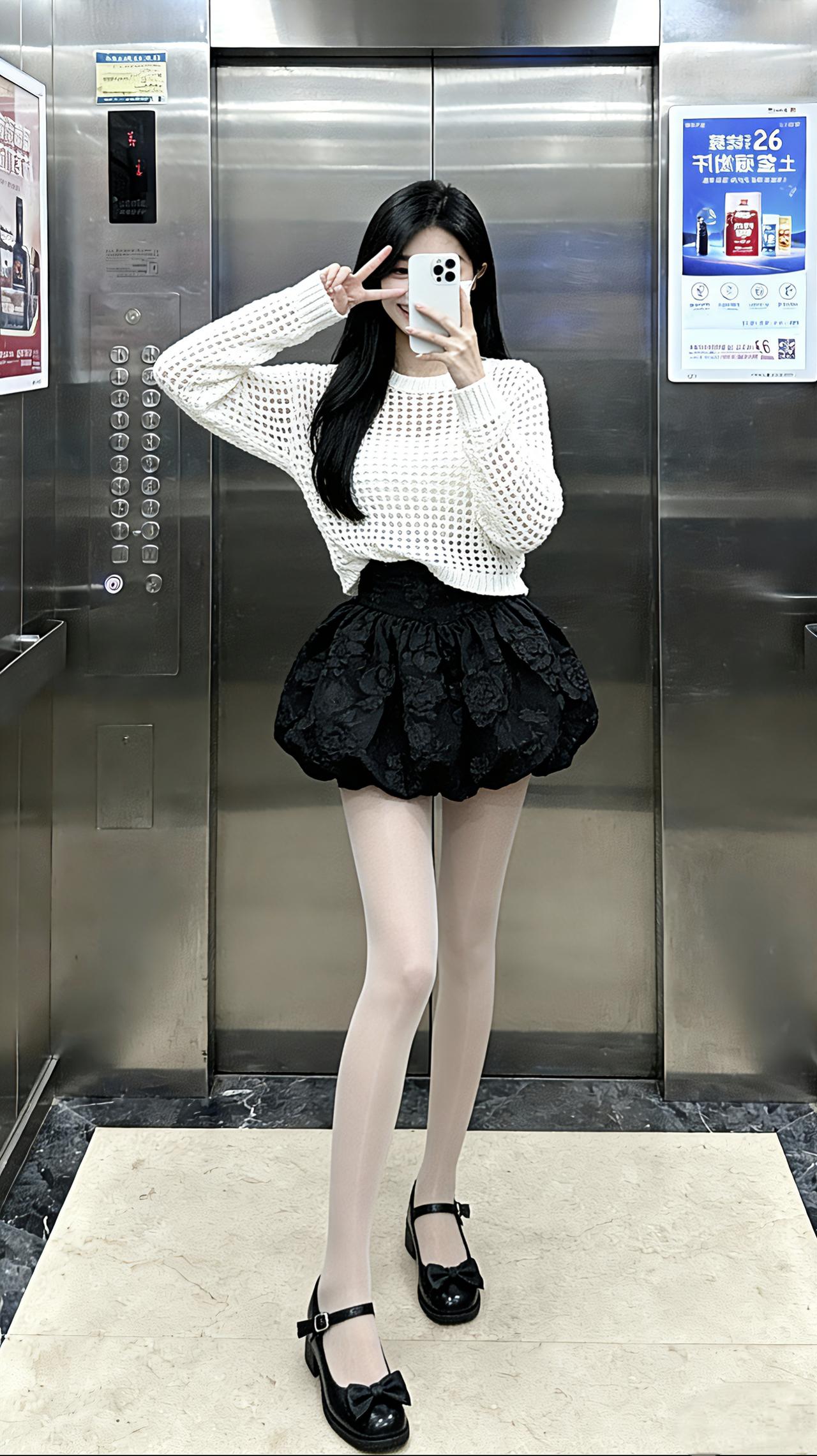 甜妹赴春光!电梯间里,奶白镂空针织裹着软乎乎的甜,黑花苞裙一摆又仙得像小裙子~蝴蝶结鞋踩出洛丽塔的娇俏。我的春日甜美ootd 电梯拍照 甜妹穿搭 甜妹