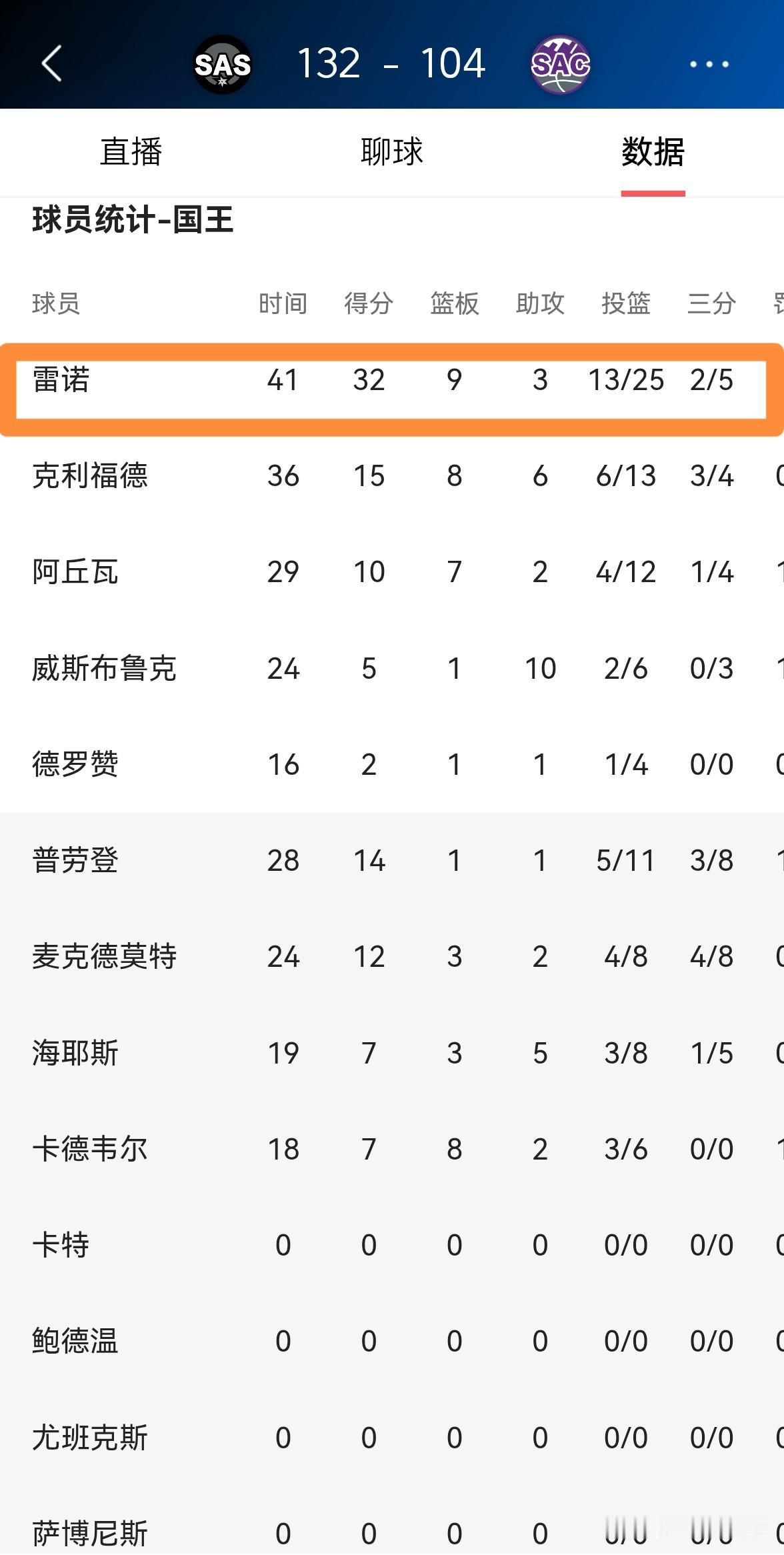 国王新秀雷诺真是杀红眼了!虽然今天国王在主场以104:132惨败于马刺,但是小将雷诺却在进攻端大发神威,他砍下了职业生涯新高的32分。 整场比赛下来,雷诺首发出战41分钟,投篮25中13,其中三分球5中2、罚球4中4爆砍32分,外加9篮板3助攻1盖帽,他的场上正负值为-22。 实事求是的说,每当我看到雷诺在场上打出精彩的表现时,我就会忍不住想起雷诺的同届新秀杨瀚森。虽然杨瀚森贵为首轮16号秀,但是杨瀚森的发展脚步已经远远落后于二轮秀雷诺了,当雷诺在NBA赛场上呼风唤雨的时候,杨瀚森却混迹于发展联盟。