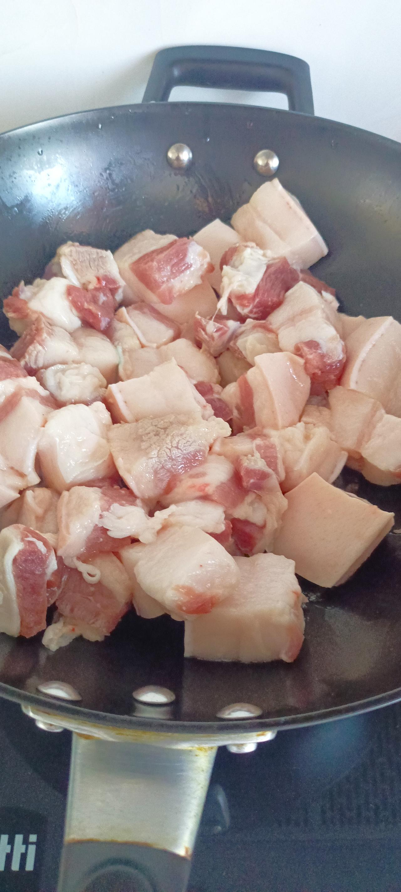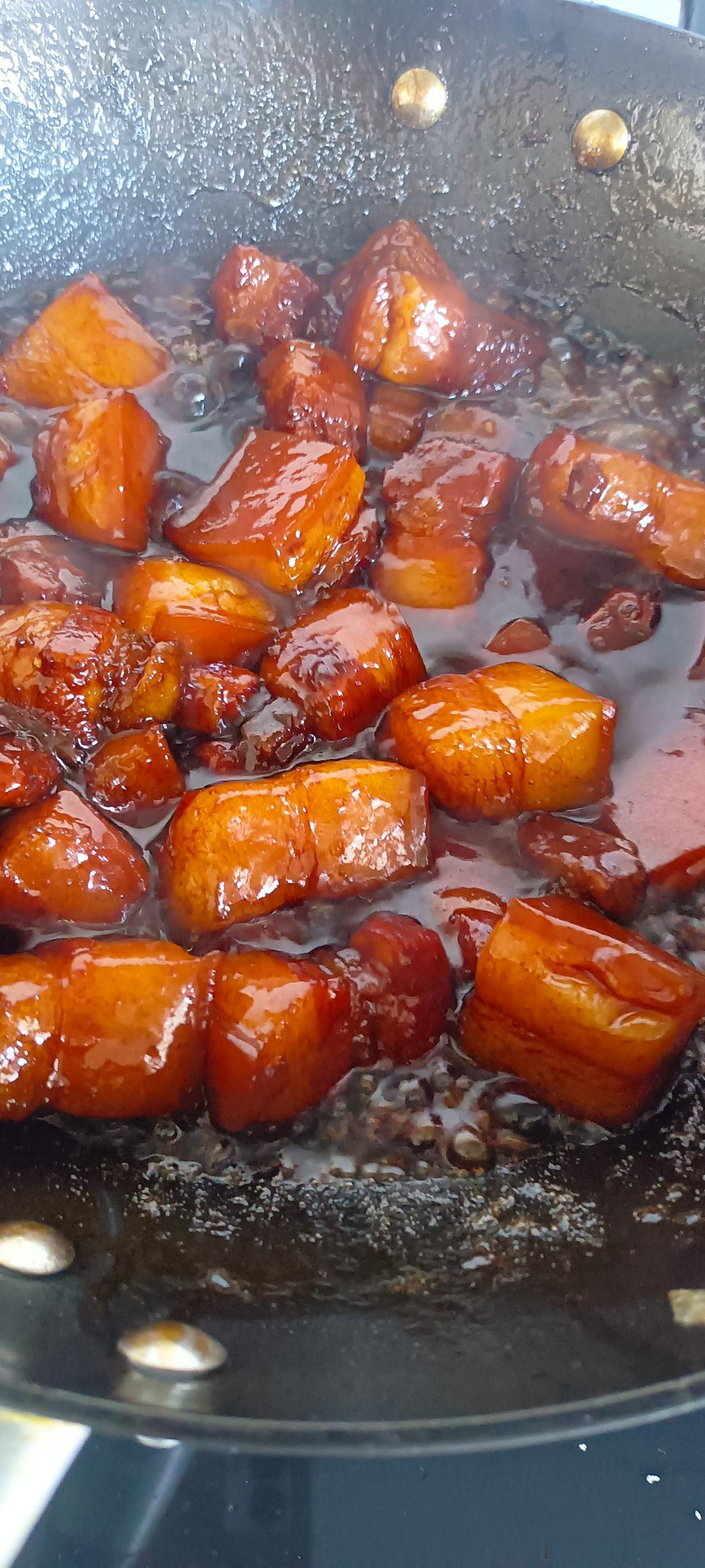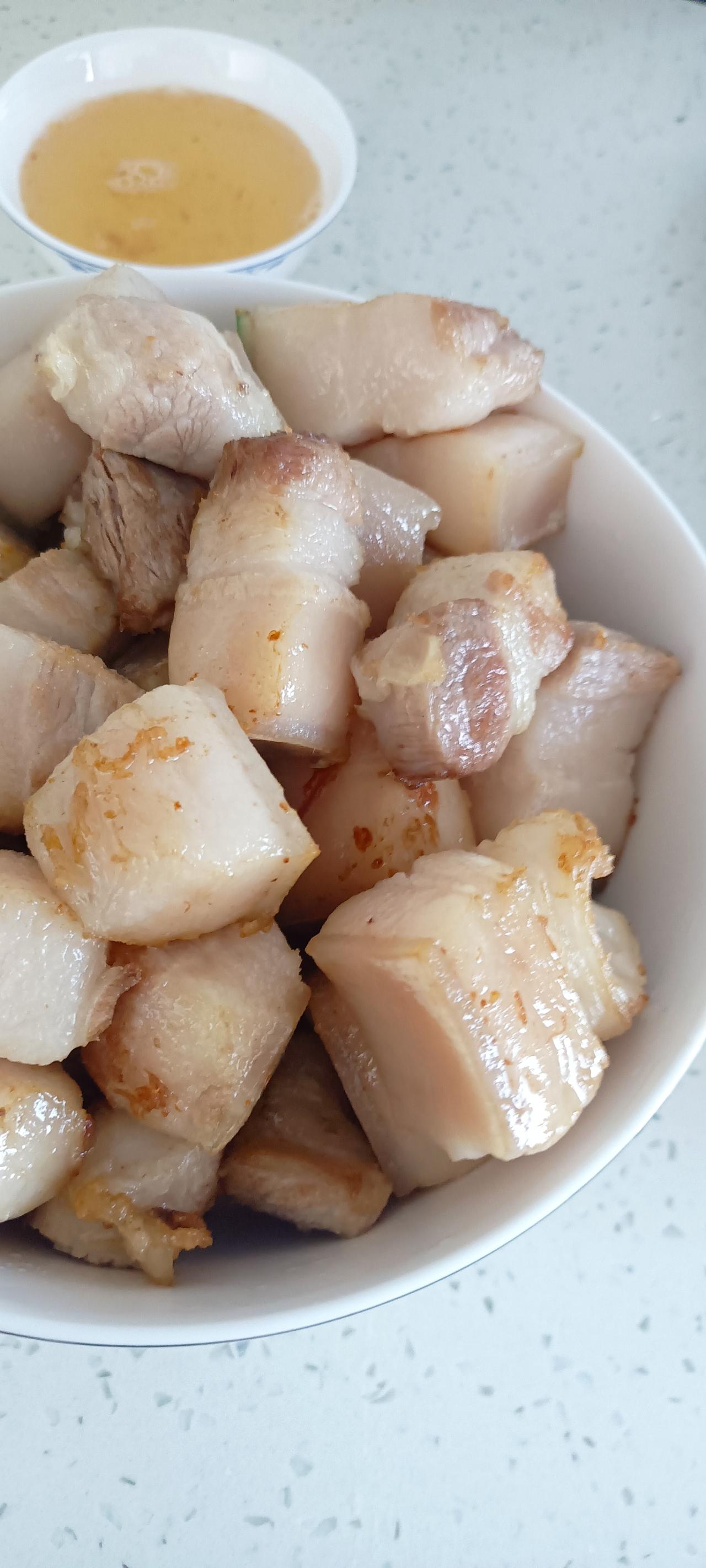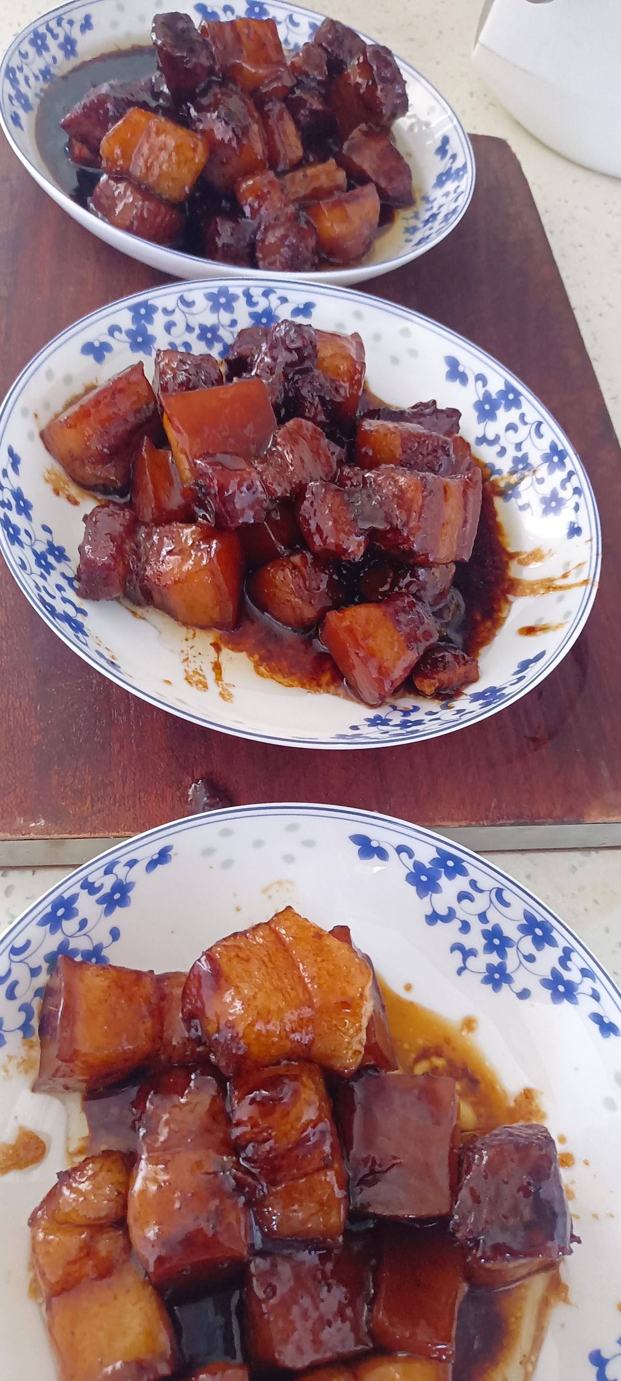 我做的红烧肉很好吃,我分享一下做法,可以收藏,真的,连我家特别挑食的老公,都说真好吃! 今早在我家早市买了三十七元钱的腰条,每斤十一元,三斤多一点。 我把上边的那一小块里脊肉取下来,放在一边,明天有时间给孩子们做个锅包肉。 其余的连肥带瘦,都做红烧肉。 我妈专门吃肥肉,我女儿吃五花三层的部分,也给我老公带回去点。 大概得有三斤肉,都做了吧。 首先切成大块肉,三厘米见方的大肉块。 锅热了,就把清洗干净的肉放入锅里炒,慢火炒,炒至金黄,肥肉里的油也出来了一小碗,把肉盛出来,荤油倒入碗里,留着炖菜用。 然后放少许底油,放入白糖,炒到能糖溜的那种状态,把肉放到糖浆里翻炒,再放入姜片葱段和三粒大料,再翻炒一会,放入适量的酱油,再放少许老抽,翻炒一会,加入热水,水和肉持平就行。 然后大火烧开,三四分钟后转小火,也不用看着,就小火慢炖,等汤汁差不多了,就改大火收汁,不放盐,最后放入松茸鲜,出锅即可。 我家做红烧肉都是这么做,用筷子轻轻一挑,肉烂乎乎的,入口即化,我家小宝宝都能吃两块。 特别是老年人,就是牙不好的也能吃几块,就是肥的更好吃肥而不腻! 真的,不信您按照我的方法试试,就是有点费时间,得一个半小时,才能出锅。 真的可有食欲了! 我分出了三份,先给我妈妈送一份去,我妈虽说有糖尿病,偶尔也得吃一顿,专门吃肥的!
