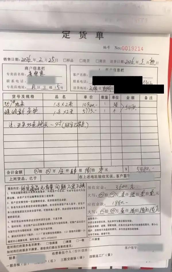 云南昆明,女子来到家具店,想买一款1.8米的床,店员推荐了一款,女子很满意,交了