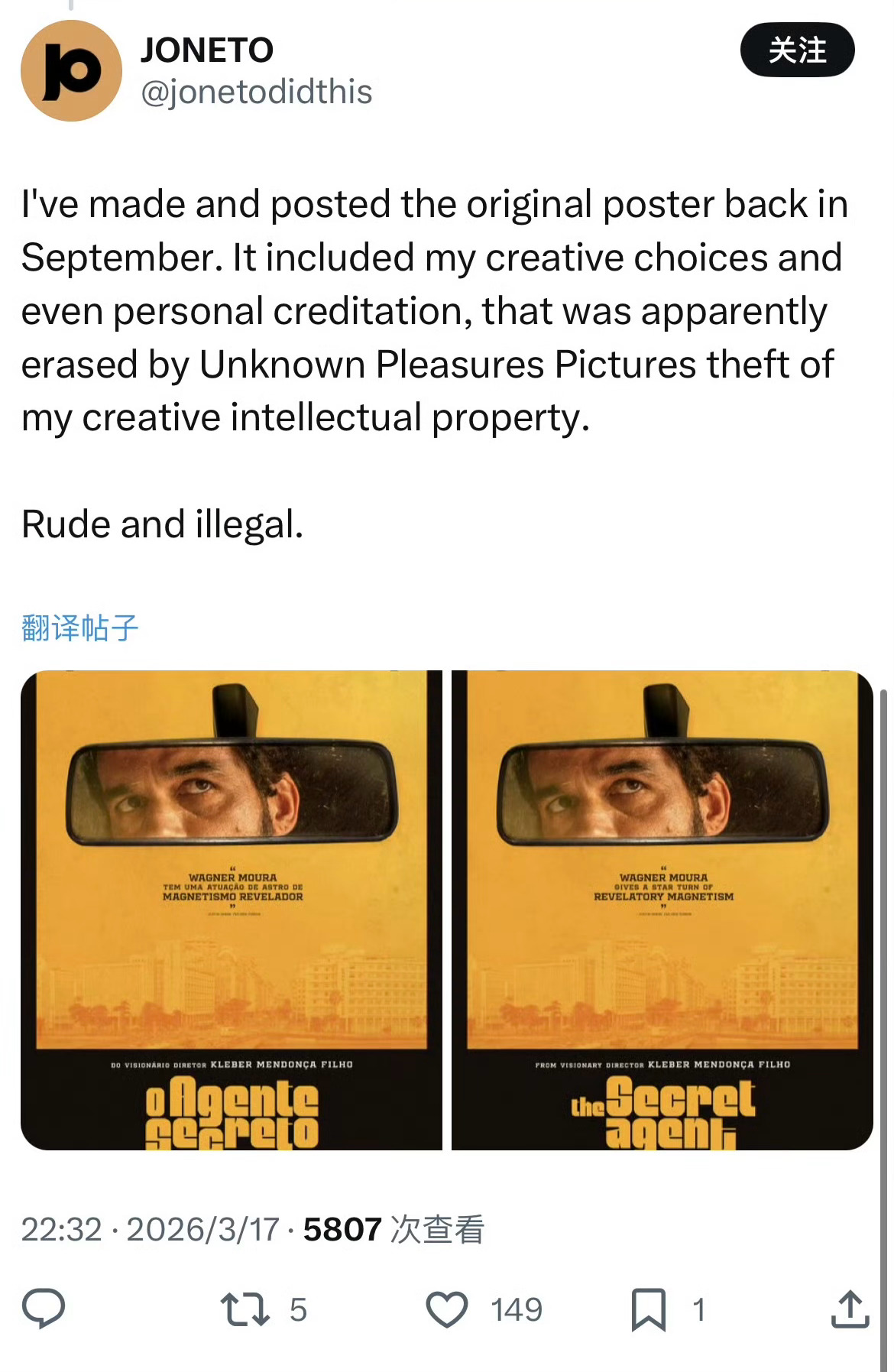一位巴西设计师说自己设计的《密探》海报被中国官方“盗用”,目前贾樟柯已经道歉。不过我觉得个人二创海报属于饭制,应该没有版权一说吧。