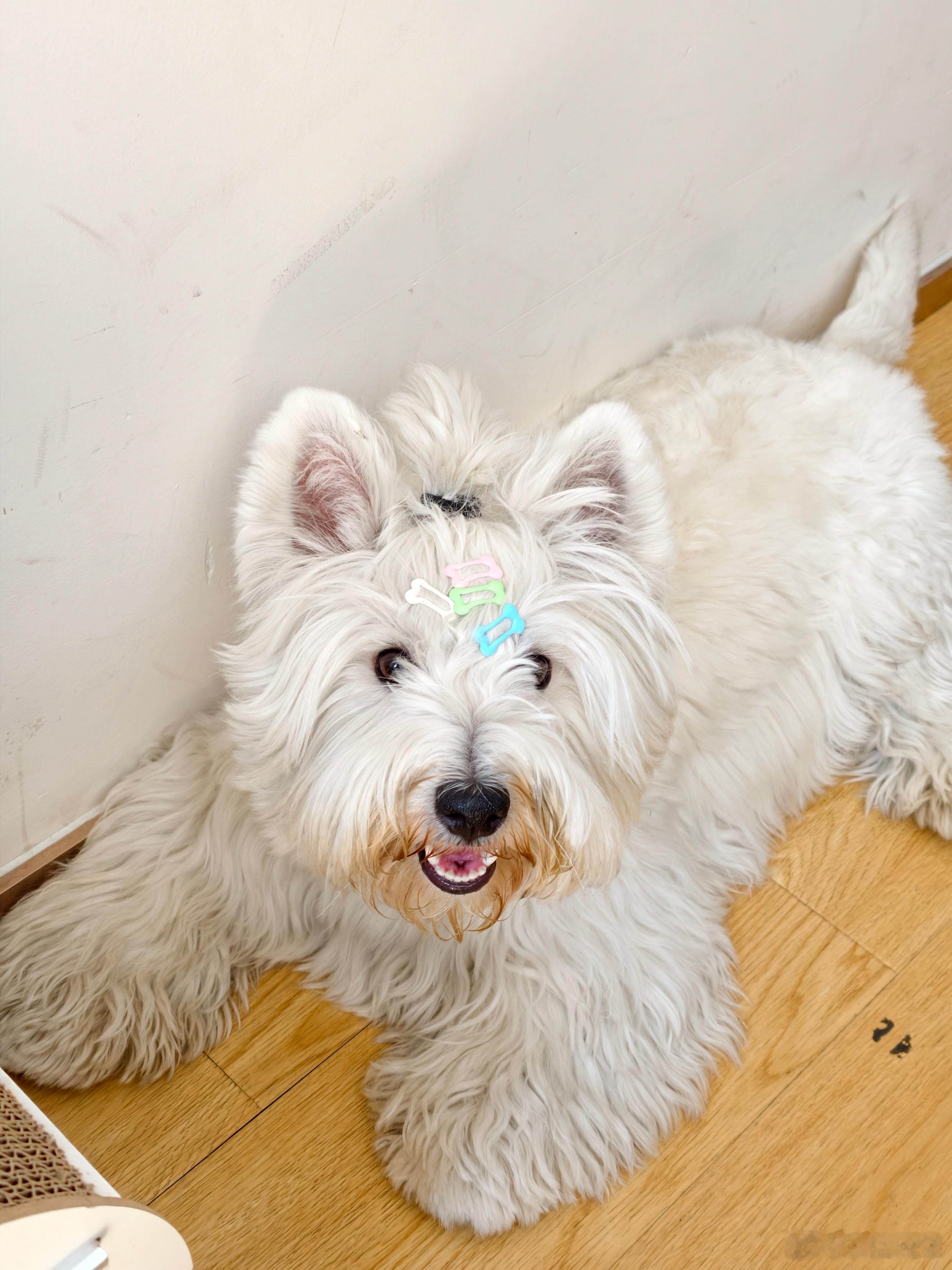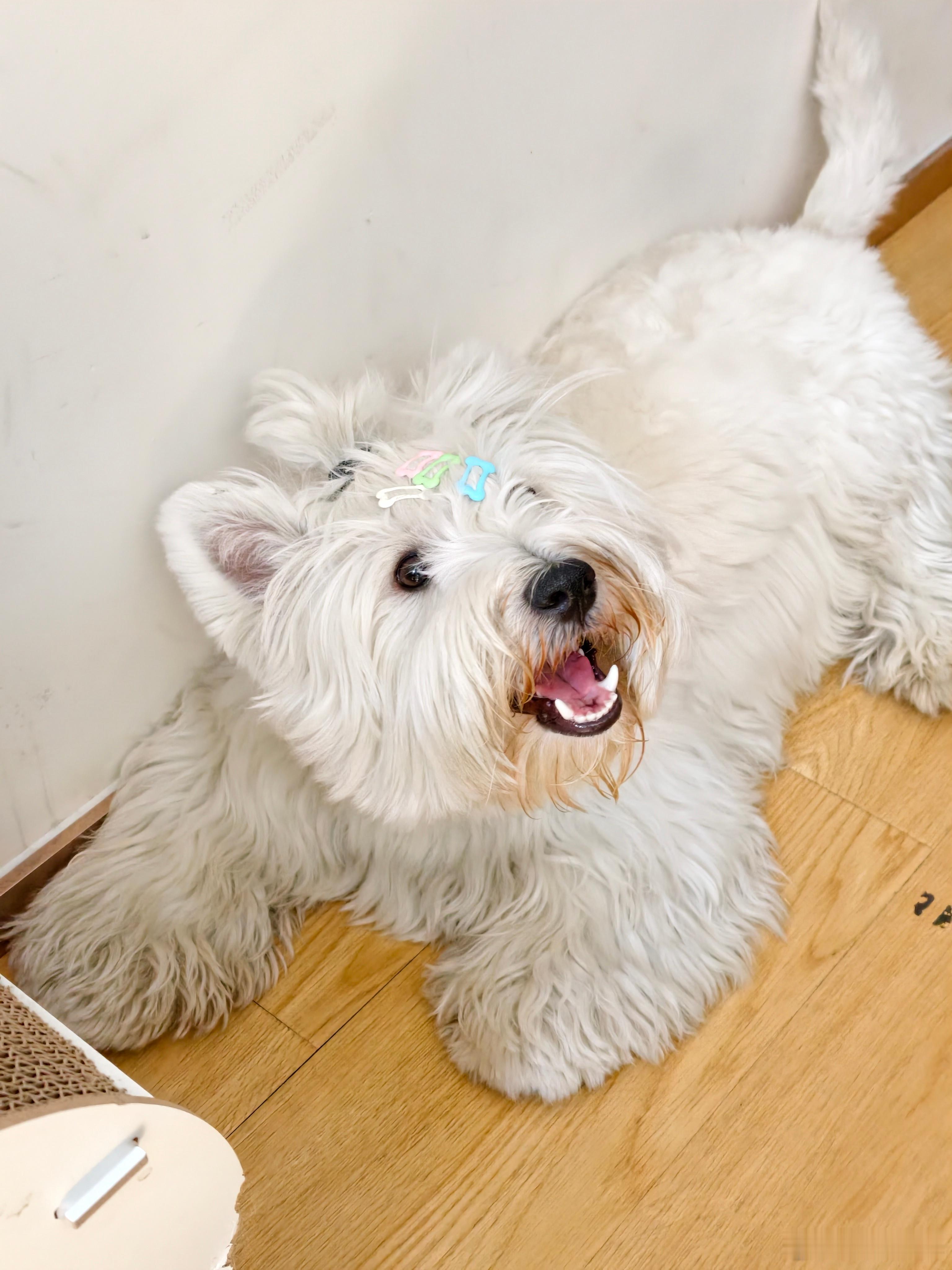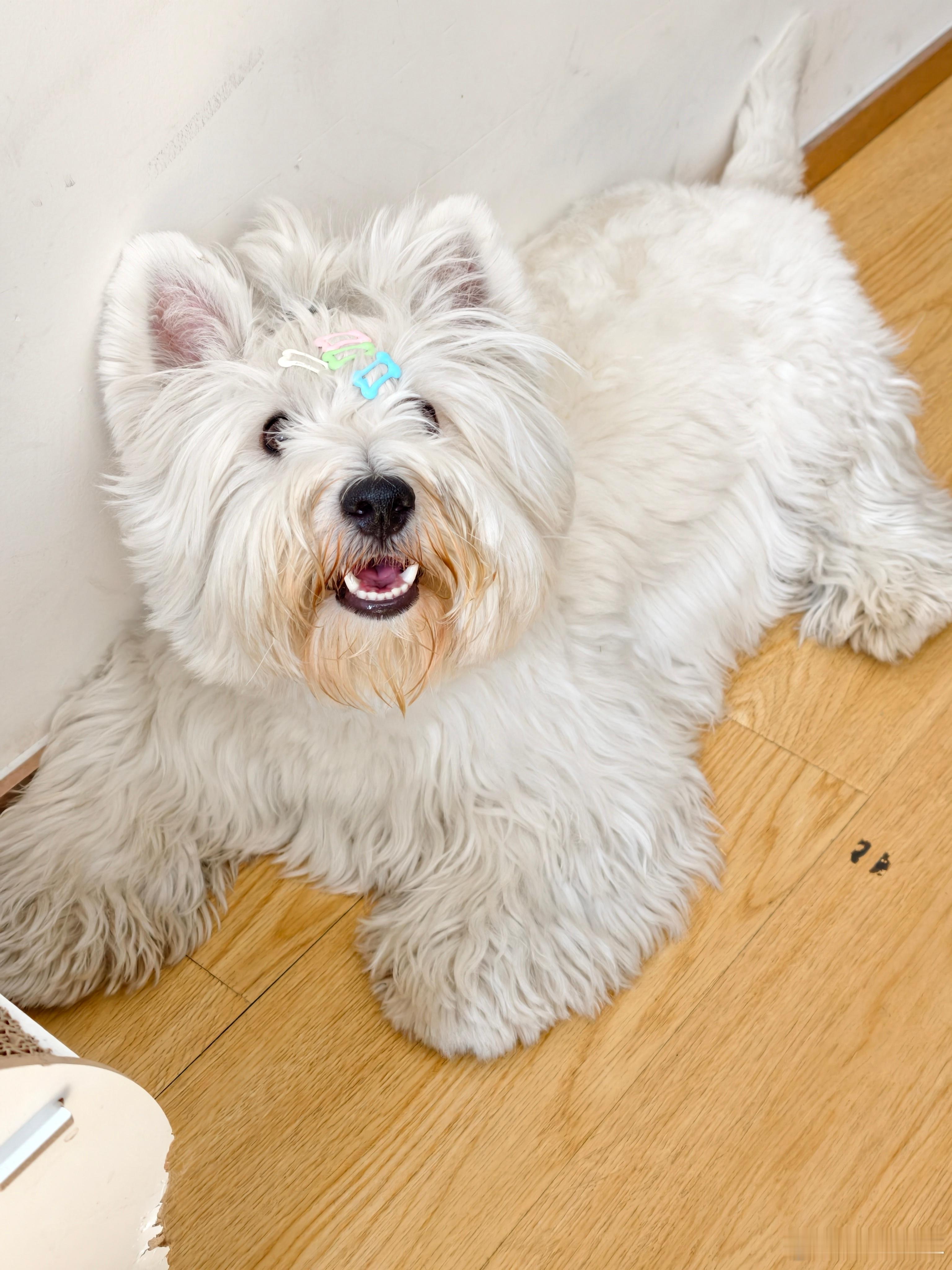 给有财扎小辫,带发卡了,有没有很可爱?昨天带它出门遛,看到它的姨姨还以为它是小女生呢萌宠西高地 小怡说车