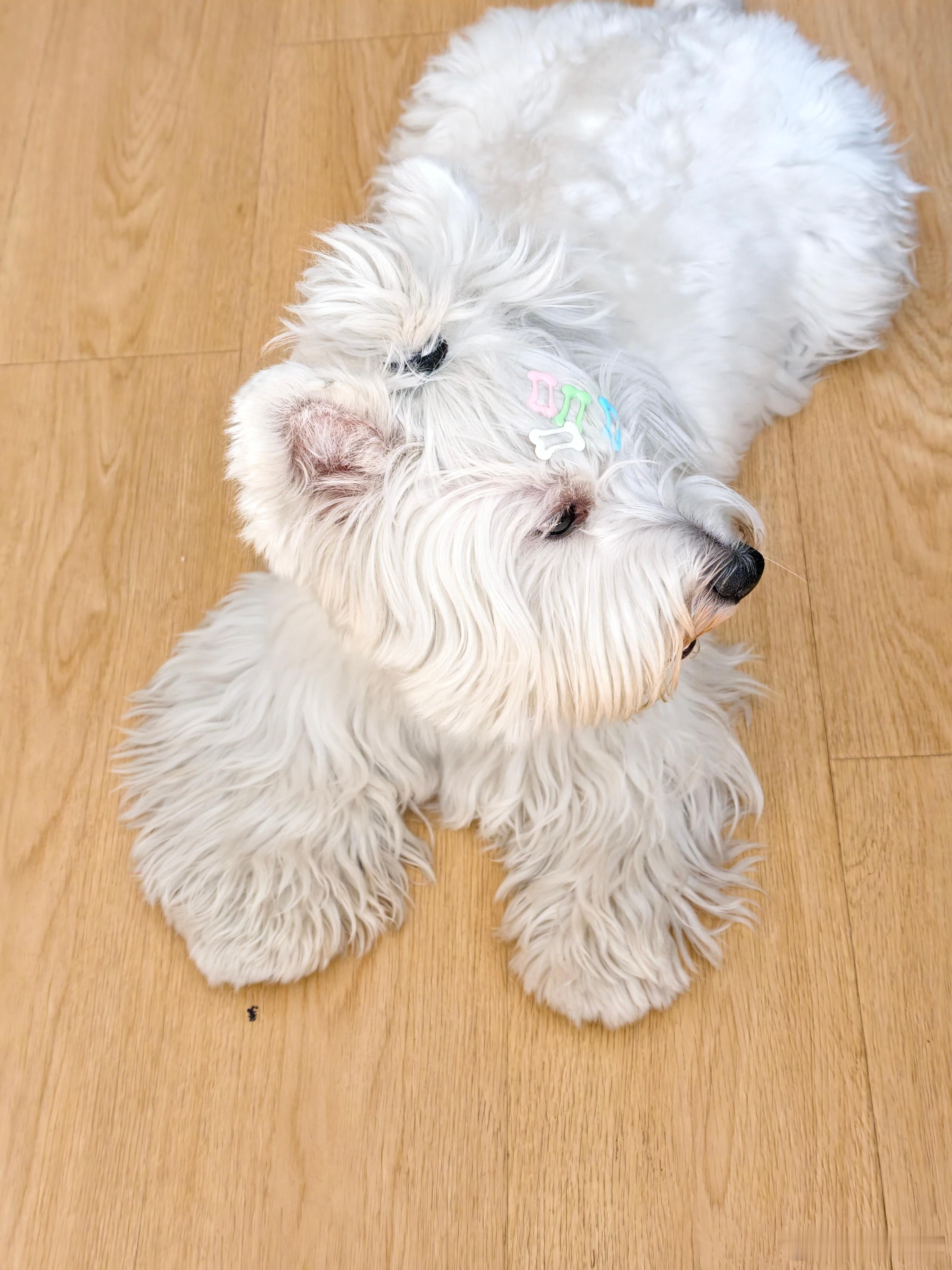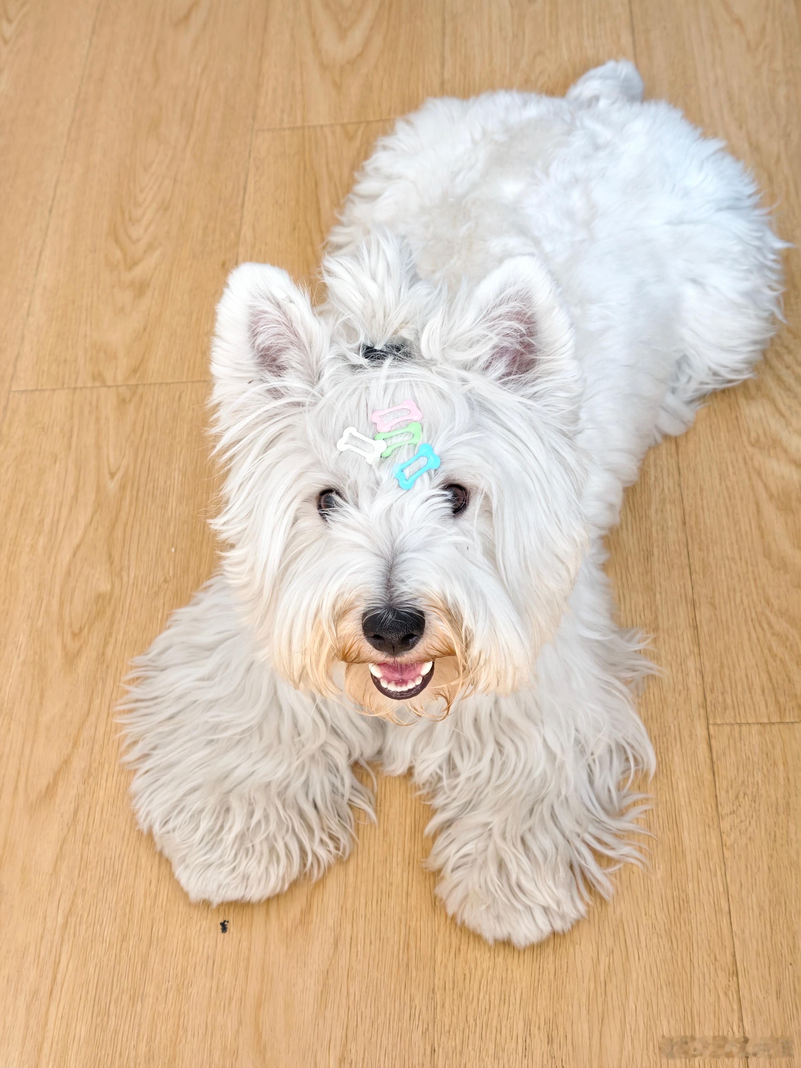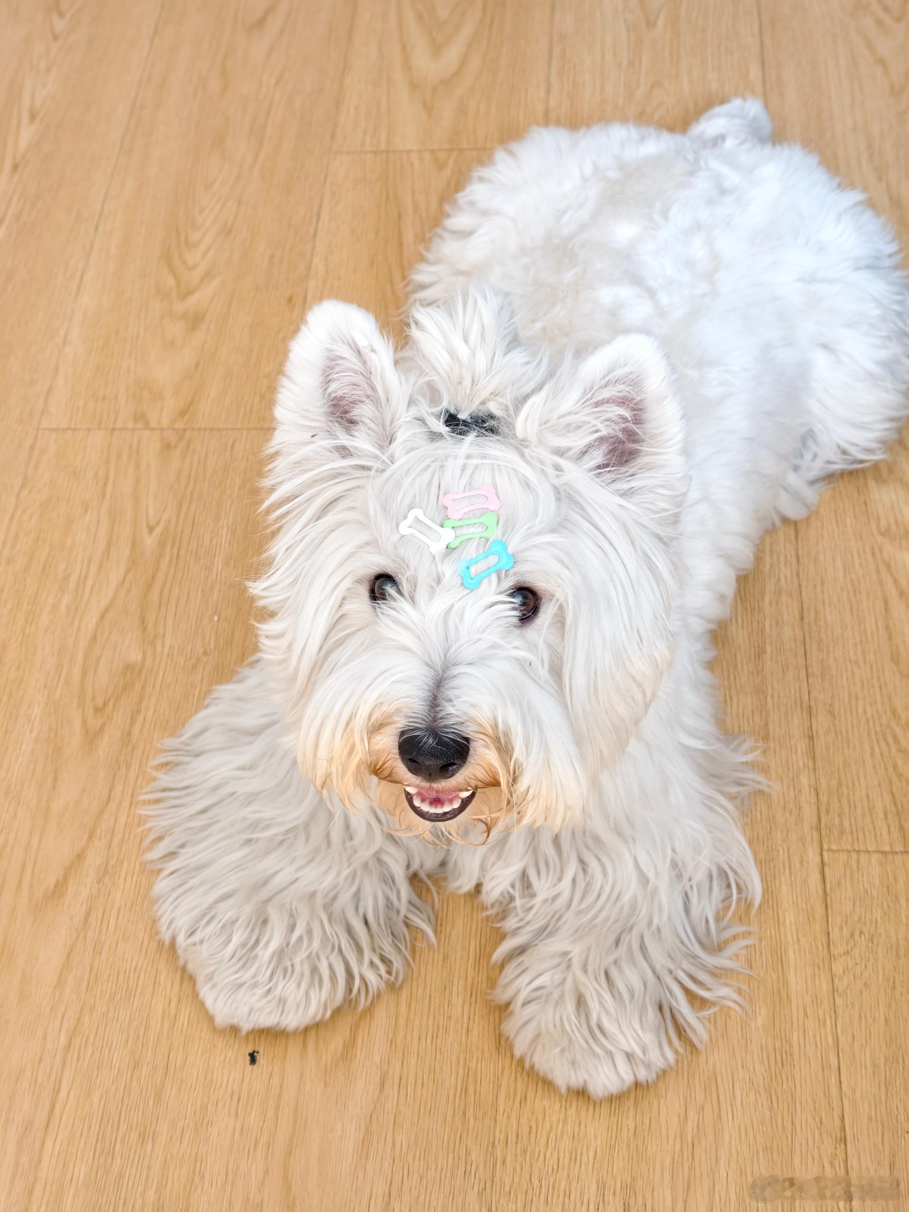给有财扎小辫,带发卡了,有没有很可爱?昨天带它出门遛,看到它的姨姨还以为它是小女生呢萌宠西高地 小怡说车