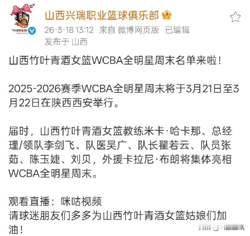 山西竹叶青酒女篮总经理、主教练、五名球员以及队医集体亮相全明星周末! 一支球队以一套主力阵容,亮相WCBA全明星周末是一种什么样的感觉?山西女篮用实际行动告诉球迷:爽! 3月20日,山西女篮俱乐部总经理/全明星北区领队李剑飞将携山西女篮主教练米卡·哈卡那、队长翟若云、队员张茹、陈玉婕、刘贝,外援卡拉尼·布朗以及队医吴广,离并参加3月21日至3月22日在西安举办的2025-2026赛季WCBA全明星周末。 在离并之前的3月19日,山西女篮俱乐部将邀请球迷到训练场,举办公开训练日活动,让球迷直观感受球队备战状态,近距离见证山西女篮的训练风采,凝练球队与球迷同心同行热情,为即将到来的季后赛做最后的冲刺。举办完这场活动后,他们将起身前往西安参加全明星周末活动。 因山西女篮在本赛季常规赛取得第一的排位,所以主教练米卡将出任全明星北区代表队主教练,黄思静担任南区主教练。需要说明的是,翟若云、张茹、陈玉婕和外援布朗参加的是全明星正赛。刘贝作为一年级新生,参加的是全明星周末星锐赛。 需要通报的是,昨天在山西女篮训练现场看到,目前山西女篮仅有布朗一名外援在球队中,惠特尔代表澳大利亚国家队参加国际三人篮球赛事归队途中,新外援夏奇拉·奥斯汀正在向球队报到的路上!