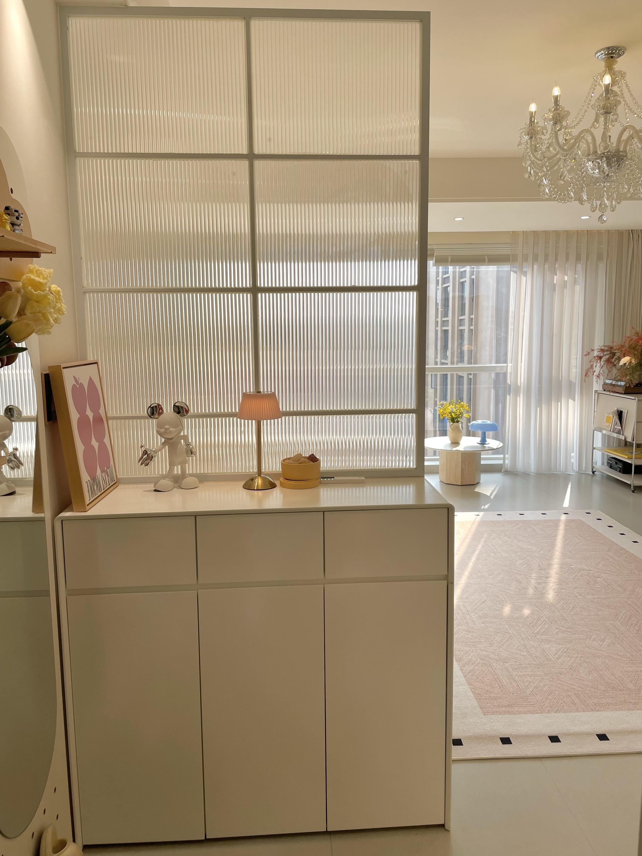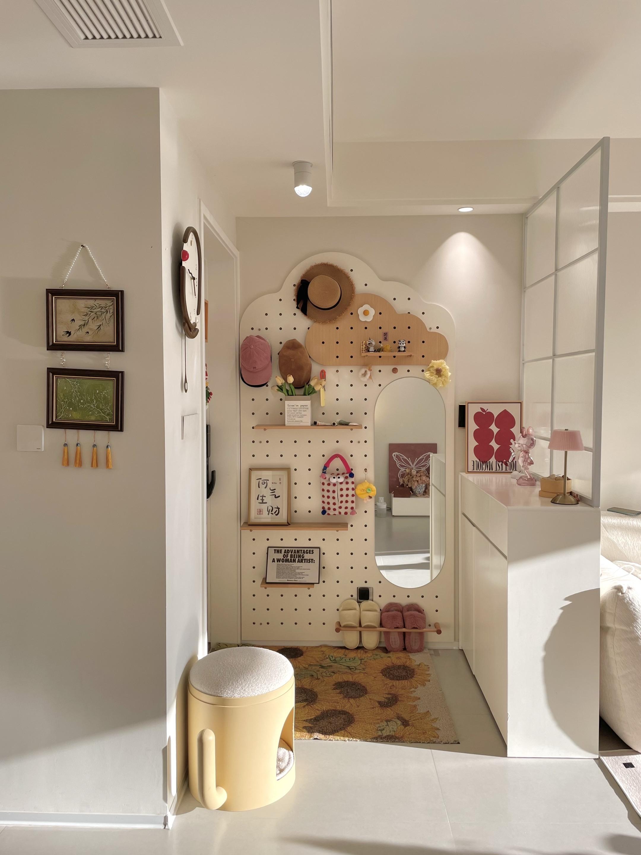小户型入户玄关布局,直接抄作业!!入户正对客厅,既没有隐私又没有收纳 所以我做了一下改动 1️⃣利用进门左侧大白墙做了满墙洞洞板,尺寸高2.2m*宽1.2m,白色+原木色搭配 既能装饰又能日常收纳,还做了穿衣镜,空间合理利用 2️⃣进门正对做了鞋柜+隔断设计,鞋柜高1m*深36cm*长1.2m,选择白色 玻璃隔断用的是超白长虹玻璃,透光不透人 满足日常放鞋需求又能遮挡隐私,还不会影响采光,一举两得 3️⃣嗐顺便把原本的猪肝红色入户门,自己改色成奶白色,自己刷了4遍,再搭配一些自己喜欢的挂件,简单又