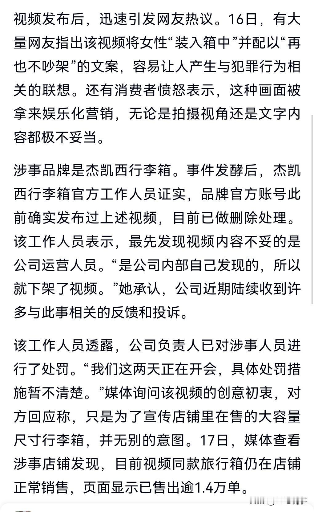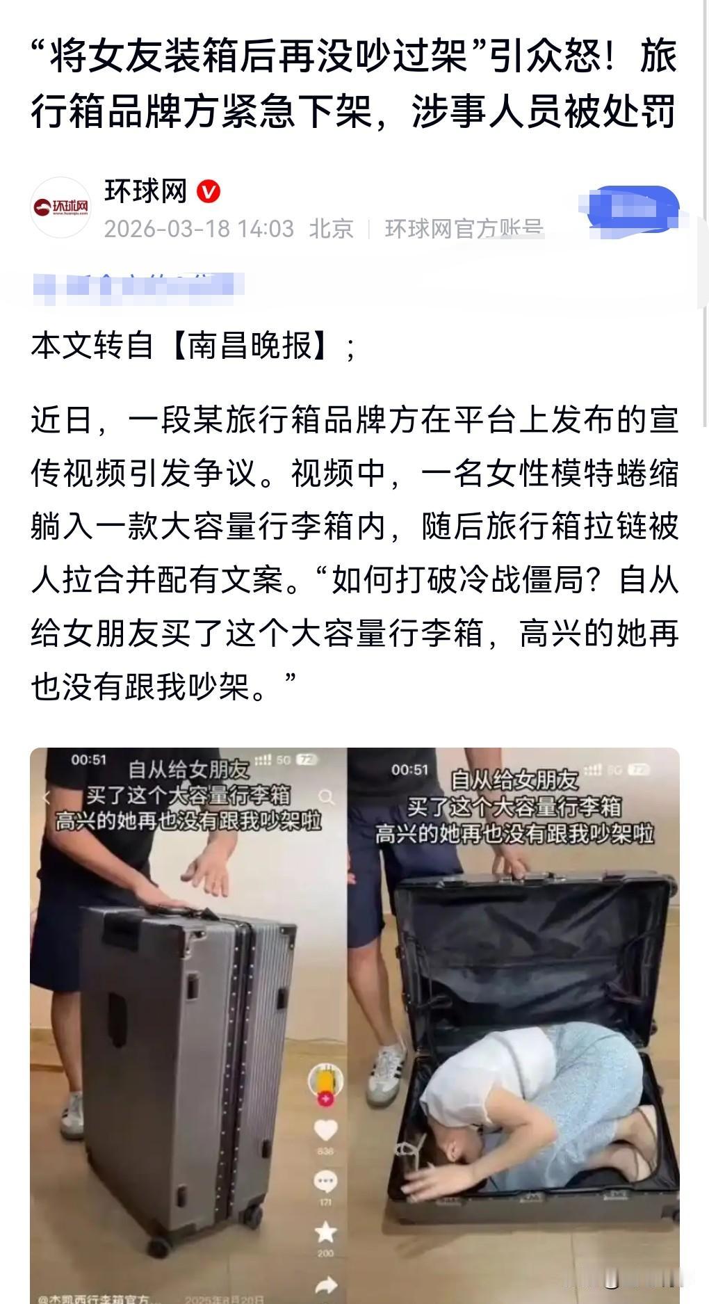 有些广告真的是教坏人,太没底线了。 近日,有一个旅行箱的广告是把女友装进箱子里面。 这真的是一个很不好的示范,容易引发犯罪问题。 旅行箱品牌方紧急下架,涉事人员被处罚。 造成这么大的负面影响。开除得了。 一个没有正常三观的人搞什么文案宣传啊。 也不知道最终拍板的是谁,难道没有发现不妥吗?