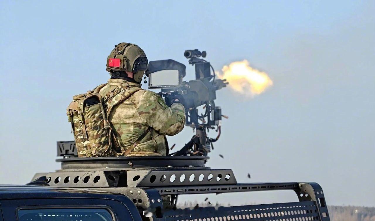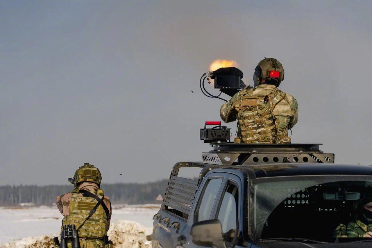 烽火问鼎计划俄乌冲突 莫斯科州的俄罗斯近卫军机动防空部队进行实弹射击训练。他们的防空机枪安装在多辆中国产长城金刚炮皮卡上。