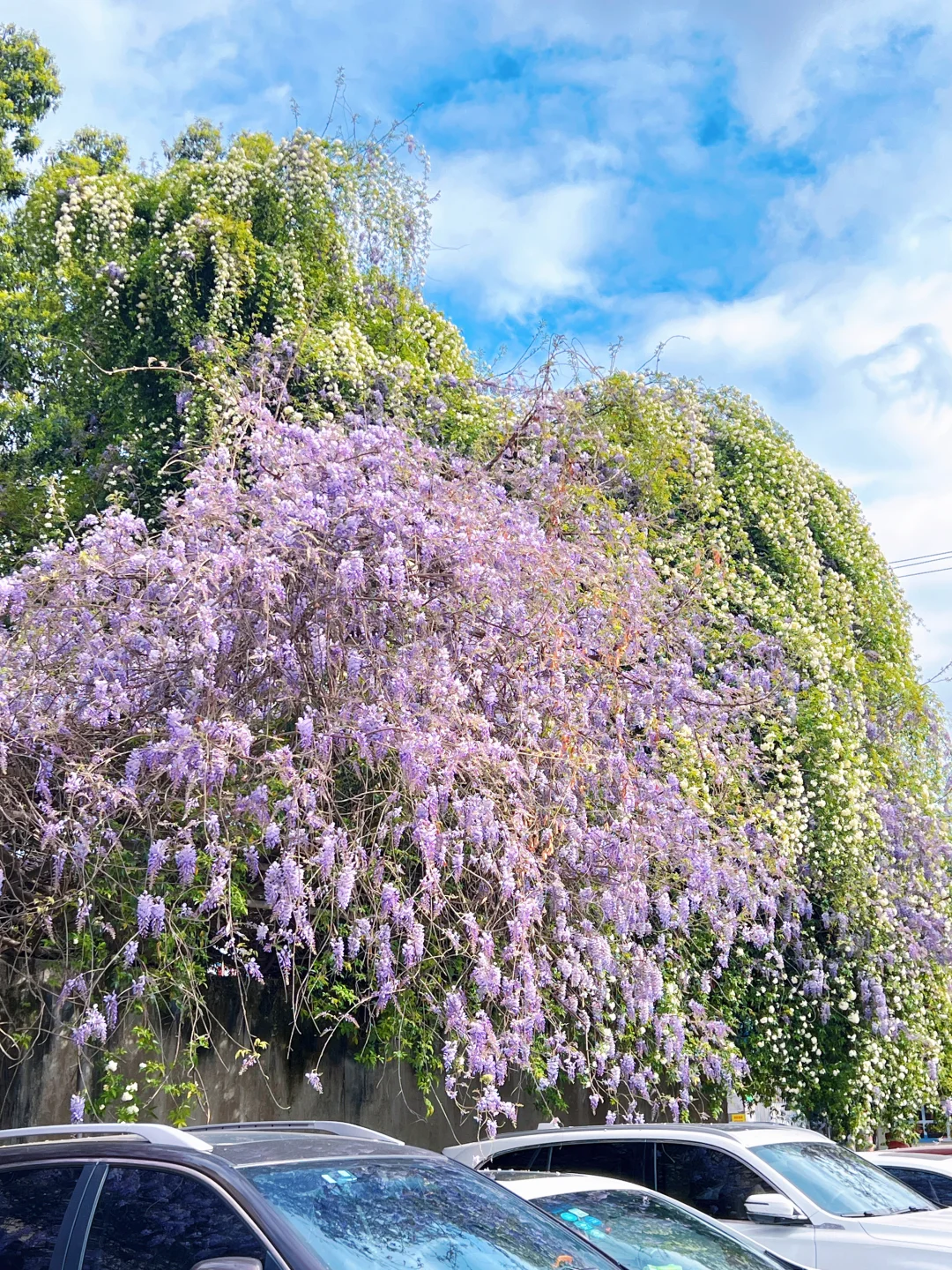 心心念念的七里香和紫藤花终于赶上了 目前花花开得正好拍照很好看 就是花墙下是停车场 早点去车子可能少一点 📍成都理工大学,从北一门进,进门就能看到