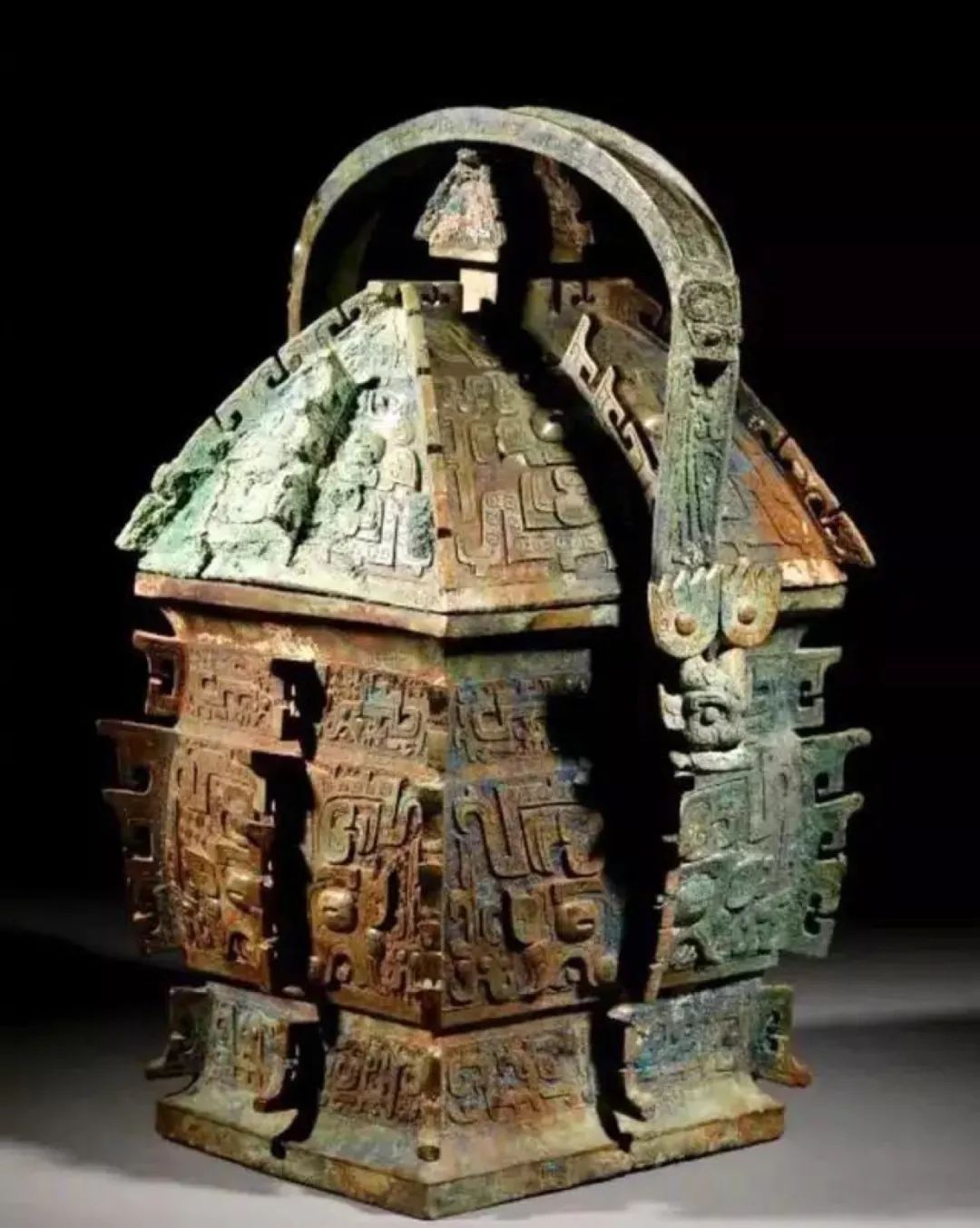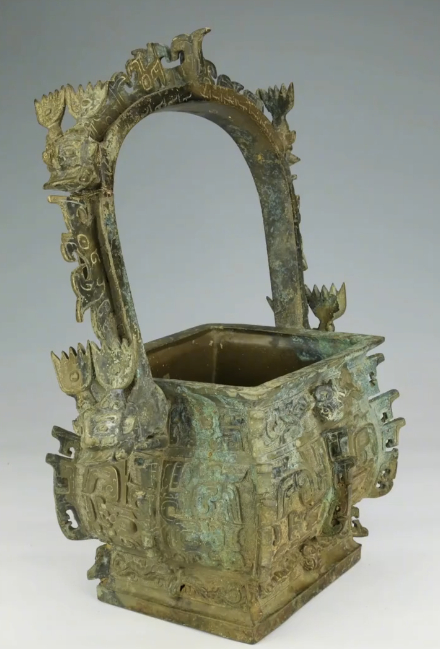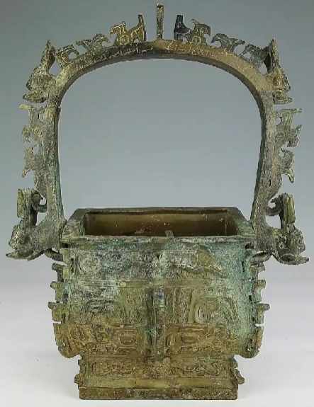 每天一件青铜器 江西省上饶市广丰县博物馆藏西周早期:提梁方卣/方彝. 失盖,1987年广丰县征集.被《新收殷周青铜器铭文暨器影汇编》收录,记录其有铭文“公作宝尊彝”.与山西青铜器博物馆藏西周早期:义方彝(图4)很像.除了腹部有精彩的曲角大兽面,提梁还有非常夸张的凤鸟形扉棱.提梁上还有四组星角兽面