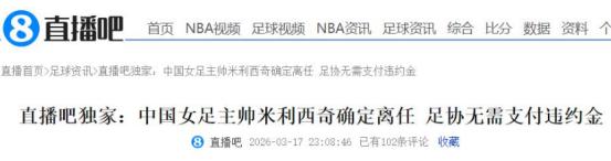中国女足出局仅3小时,51岁主帅突然离任,无需付违约金原因曝光   2026年女足亚洲杯半决赛,中国女足1-2输球,无缘晋级决赛,同时连续14年各项赛事不胜澳大利亚女足,战绩为4平8负。   这场比赛的结束,不仅碎了女足姑娘们的卫冕梦,更让全网球迷陷入沉默。终场哨响那一刻,珀斯体育场的中国女足队员们垂着头,不少人红了眼眶。她们拼到了最后一秒,可还是没能跨过澳大利亚这道坎。   没人能想到,更劲爆的消息还在后面。比赛结束仅仅3个小时,官方就放出消息,51岁的澳大利亚籍主帅米利西奇,正式确认离任。   这个消息一出,全网直接炸了。很多球迷第一反应就是,是不是因为输球被紧急追责,才被火速解雇。毕竟女足是卫冕冠军,止步半决赛的成绩,确实让不少人难以接受。   可事实并不是大家想的那样,米利西奇的离任,根本不是临时决定,更不是足协的紧急追责。他的离开,早在四个多月前就已经定下了基调,这场半决赛的失利,只是走完了最后一道程序而已。   米利西奇是2024年正式接手中国女足的,他和中国足协签订的合同,原本要到2027年巴西女足世界杯结束。正常情况下,如果足协单方面解约,需要支付高达2100万人民币的违约金,这笔开支对足协来说压力不小。   转折点出现在2025年11月,温布利球场的那场惨败。中国女足0-8输给英格兰女足,追平了队史最大分差失利。那场比赛之后,米利西奇就彻底陷入了下课危机,舆论的质疑声铺天盖地,足协也承受着巨大的上层压力。   就在双方陷入解约僵持,谁都不愿让步的时候,米利西奇主动提出了一个方案。他表示自己愿意继续带队,打完2026年女足亚洲杯,全程尽职尽责备战、参赛,不耽误球队冲击世界杯名额的核心目标。   作为交换,米利西奇提出,等亚洲杯全部结束后,他主动离职,并且放弃合同里所有的违约金,足协不需要承担任何赔偿责任。   2025年12月,中国足协和米利西奇正式达成了这份“君子协议”。双方都没有对外公开这件事,目的就是为了让球队安心备战亚洲杯,避免舆论干扰到球员们的状态。   这份协议里还有一个关键条款,只有米利西奇带队成功闯入亚洲杯决赛,才能自动触发原有合同的续约,否则赛事结束后就立即离任。   所以这场半决赛,对米利西奇来说,就是一场“赢或走人”的终极考验。很可惜,中国女足1-2不敌澳大利亚,没能闯入决赛,这份协议里的解约条款,也随之自动触发。   这就是为什么女足出局仅3小时,米利西奇离任的消息就火速官宣,没有任何拖延和争议。双方早就有约定,输球就体面分手,互不纠缠。   很多人都疑惑,米利西奇为什么愿意放弃2100万的巨额违约金,选择“裸辞”。其实核心原因很简单,他心里清楚,0-8惨败英格兰之后,自己的执教口碑和信任度已经大幅下滑。   就算继续留任,他也会面临更多的质疑和压力,很难顺利开展执教工作。他作为一名职业教练,非常看重自己的职业声誉,主动放弃违约金、带队打完亚洲杯,能给自己的中国执教生涯,画上一个体面的句号。   这样做,既避免了和足协陷入解约纠纷,影响自己后续的执教生涯,也能保住自己的职业体面,不用带着中途下课的遗憾离开。   客观来说,米利西奇执教中国女足近两年,不能说完全失败。他累计带队出战16场国际A级赛事,取得了9胜1平6负的战绩,胜率超过了50%。   本届亚洲杯,他带领中国女足小组赛三连胜,力压朝鲜以小组头名出线,1/4决赛鏖战120分钟击败中国台北,成功锁定2027年巴西世界杯的入场券,完成了足协交代的核心保底目标。   但他的执教,也存在很多难以忽视的短板。他上任后试图推行传控足球打法,可中国女足球员的技术特点、体能储备,并不适配这套体系,导致球队进攻端打法混乱,中场组织缺乏连贯性。   而且他执教期间,考察了近90名球员,看似在推动阵容换血,可实际大赛中,依旧依赖王霜、张睿、吴海燕等老将,年轻球员获得的实战机会极少,球队的新老交替进展缓慢。   更关键的是,中国女足面对欧美强队全线溃败,除了0-8惨败英格兰,还0-3不敌美国、0-2输给荷兰,面对亚洲顶级对手澳大利亚、日本,也始终无法取胜,硬仗疲软的问题格外突出。   米利西奇的离任,算是双方双赢的结果。足协不用支付巨额违约金,还能保证球队亚洲杯备战不受影响,实现平稳过渡。米利西奇则能完整走完执教周期,体面地结束自己的中国女足执教生涯。   现在主帅离任,中国女足又将面临新的挑战。球迷们不用过度焦虑,女足姑娘们已经拼尽了全力,连续14年不胜澳大利亚的魔咒,也不是一时半会儿就能打破的。   相信只要调整好状态,找到合适的新主帅,补齐自身短板,铿锵玫瑰终将重新绽放,早日跨过澳大利亚这道坎,再创辉煌。