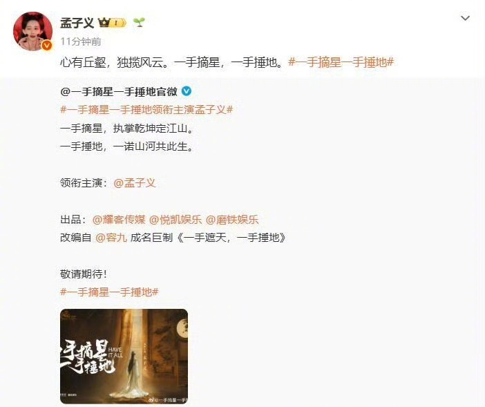 孟子义新角色为失忆监国公主孟子义新剧《一手摘星一手捶地》期待值拉满!失忆监国公主萧其棠人设超带感🔥~权倾朝野+失忆反转+黑色幽默,剧本精心打磨18个月,又美又飒,一手摘星一手掌印,这角色真的太适合她了!坐等开播,看姐姐强势逆袭~