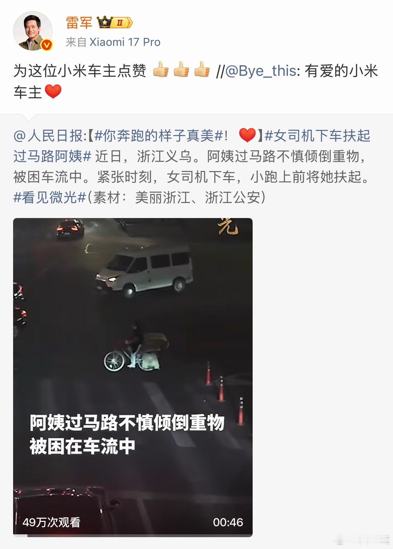 雷军点赞小米车主助人善举这才是我上网应该看到的东西。阿姨过马路时自行车因为重物摔倒了,一位小米车主看到后小跑过去帮阿姨扶了起来,并且绿灯亮起后还向后车致歉。非常有爱心有素质的一位车主,向她点赞。人与人之间本就应该多一些温度,互相抱有善意。确实车企可以多宣传宣传这样的事情,小米车主都很优秀