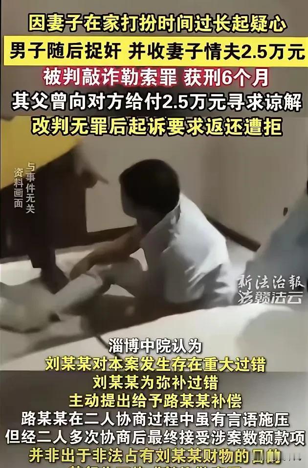妻子在辅导班楼下开房,丈夫抓奸收2.5万补偿,反被判刑6个月!反转再反转,结局让人意外 山东淄博,一个男人,因为抓奸,被判了6个月。 他叫路某。 那天,妻子说要送孩子上辅导班。 出门前,她画了很浓的妆。 路某心里犯嘀咕:送个孩子,至于吗? 他悄悄跟在后头。 结果妻子把孩子送进辅导班,转身进了楼下的酒店。 路某跟着进去,推开门,妻子和另一个男人,躺在床上。 他当场就炸了。 “孩子在楼上上课,你在楼下干这事?” 冲上去,打了那个男人一拳。 那个男人叫刘某,自知理亏,没敢还手。 他主动提出:这事私了吧,我给你2.5万补偿。 路某同意了。 刘某转账,2.5万到账。 路某以为这事就翻篇了。 结果刘某回去越想越不痛快,转头报警了,说路某敲诈勒索。 路某被抓了。 2021年,淄博张店区法院一审判决: 路某以非法占有为目的,以暴力威胁方式索要财物,数额较大,构成敲诈勒索罪。 判刑6个月,罚款5000元。 路某懵了。 明明是被戴绿帽子,明明是对方主动给钱,怎么就成了我犯罪? 他不服,上诉。 淄博中院二审,驳回,维持原判。 路某坐牢去了。 6个月,一天没少。 出来之后,他还是想不通。 这事后来引起了关注。 山东高院审查后认为,案子有疑点,让淄博中院再审。 再审结果出来了:路某无罪。 理由是刘某明知路某妻子已婚,却与其发生不正当关系,严重违背公序良俗,存在重大过错。 是刘某为弥补过错,主动提出给路某补偿,路某不存在非法占有行为。 敲诈勒索不成立。 路某等了两年,终于等来清白。 无罪了,但路某还有一件事放不下。 那2.5万补偿,当初刘某报案后,路某父亲为了救儿子,已经还给了刘某。 刘某还出了一份谅解书。 路某现在觉得:既然我无罪,这钱就不该还。 他以“不当得利”为由,起诉刘某,要求返还2.5万加利息,一共2.8万。 2025年3月13日,张店区法院驳回了他的请求。 理由是:诉讼主体不适格——当初还钱的是路某父亲,不是路某本人。 路某不服,准备上诉。 网友炸了 “出轨的没事,抓奸的坐牢,这什么逻辑?” “刘某主动给钱,事后反悔报警,这叫敲诈?” “最惨的是路某,戴绿帽子、坐牢、罚款,现在钱还要不回来。” “刘某这波操作太恶心了,先花钱消灾,再报警把人送进去。” 也有人替刘某说话: “他确实有错,但路某打人也是事实。主动给钱和被迫给钱,法律上区别很大。” “路某最该起诉的是他老婆,不是刘某。” 这事到现在,已经折腾了四年。 路某被戴了绿帽子,坐了6个月牢,罚了5000块,现在还在追那2.5万。 而那个出轨的妻子,那个主动给钱又反悔报警的情夫,什么事都没有。 法律的逻辑是:路某打人,违法;刘某给钱,可以反悔。 但人性的逻辑是:你睡我老婆,我打你一拳,你给钱私了,天经地义。 两条逻辑撞在一起,路某撞得头破血流。 再审改判无罪,算是给他一点公道。 但那2.5万,他能要回来吗? 不知道。 但有一点是确定的:这个教训,他这辈子都不会忘。 你觉得路某该不该拿回那2.5万?评论区聊聊。 现场捉奸 捉奸行为 出轨应否入刑 偷情案 捉奸视频 合法捉奸 婚內强奸案