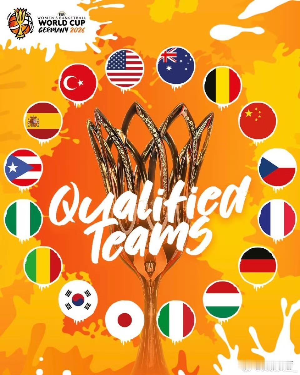 2026女篮世界杯正赛名单揭晓! 亚大区:澳大利亚、中国、日本、韩国 非洲区:尼日利亚、马里 美洲区:波多黎各、美国(卫冕冠军) 欧洲区:比利时、西班牙、意大利、法国、匈牙利、捷克、土耳其、德国(东道主) 按照赛程安排,分组抽签仪式将于4月21日在德国柏林举行。