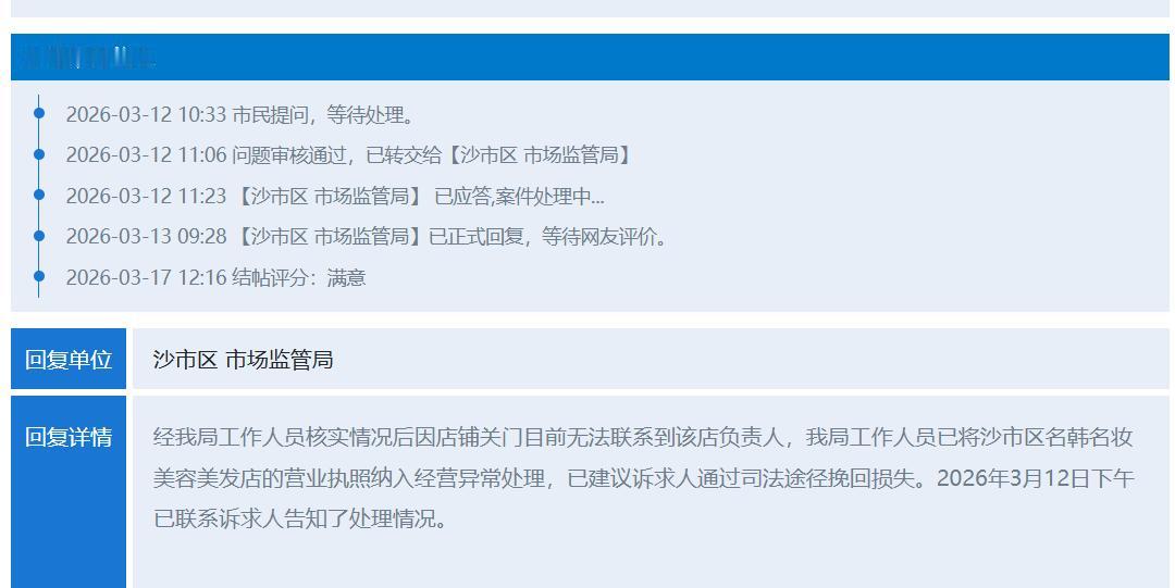 预付 870 元商家就关门失联?沙市这位市民的维权经历给所有人提了醒 充了会员卡还没消费完,商家就悄悄关门跑路,连个招呼都不打,想退钱找不到人,这种糟心事很多人都遇到过,沙市这位市民就踩了大坑。 他的家人 2025 年在沙市区立新街道一家美容美发店预付充值,账户里还剩 870 多元没花,结果店铺长期关门停业,连搬迁或退费说明都没有。 更闹心的是,小区里还有多位居民和他一样,卡里都有未消费余额,大家一起想联系商家协商退款,却根本找不到人,维权陷入僵局。 他先拨打 12315 投诉,得到的回复是只能把店铺营业执照列入经营异常名录,建议自行报警或走司法途径,这让上班族的他犯了难。 因为平时要上班,没足够时间和精力处理复杂的报警、起诉流程,维权渠道受限,无奈之下他只能通过平台求助,希望部门能协助协调。 沙市区市场监管局很快介入核实,确认店铺确实关门停业,无法联系到负责人,随后将该店营业执照列入经营异常名录。 工作人员也联系了这位市民,告知处理情况,并再次建议他通过司法途径挽回损失,虽然没直接帮他追回钱,但也算推进了一步。 最终这位市民给处理结果打了 “满意” 的评价,也能看出他理解了部门的权限边界,接受了通过法律手段解决问题的建议。 这件事也给所有喜欢预付充值的人提了醒,美容、健身、教育培训这类预付费消费,风险其实很高,商家跑路的案例屡见不鲜。 大家在充值前一定要多留个心眼,尽量选择经营时间长、口碑好的商家,不要一次性充太多钱,避免钱打了水漂。 如果遇到类似情况,除了拨打 12315 投诉,还可以联合其他受害者一起收集证据,比如充值记录、聊天截图,集体走司法程序。 市场监管部门也在持续加强对预付费消费的监管,将失联商家列入经营异常,会对其后续经营、贷款等产生限制,形成震慑。 虽然司法途径需要花费一些时间和精力,但对于金额较大的预付费纠纷,还是能有效维护自身合法权益,不要轻易放弃。 预付费消费的坑,本质上是信息不对称和信任危机,只有消费者提高警惕、部门加强监管,才能减少这类维权事件的发生。 希望这位市民能顺利通过司法途径追回余额,也希望更多人能从这件事里吸取教训,理性消费,保护好自己的钱袋子。