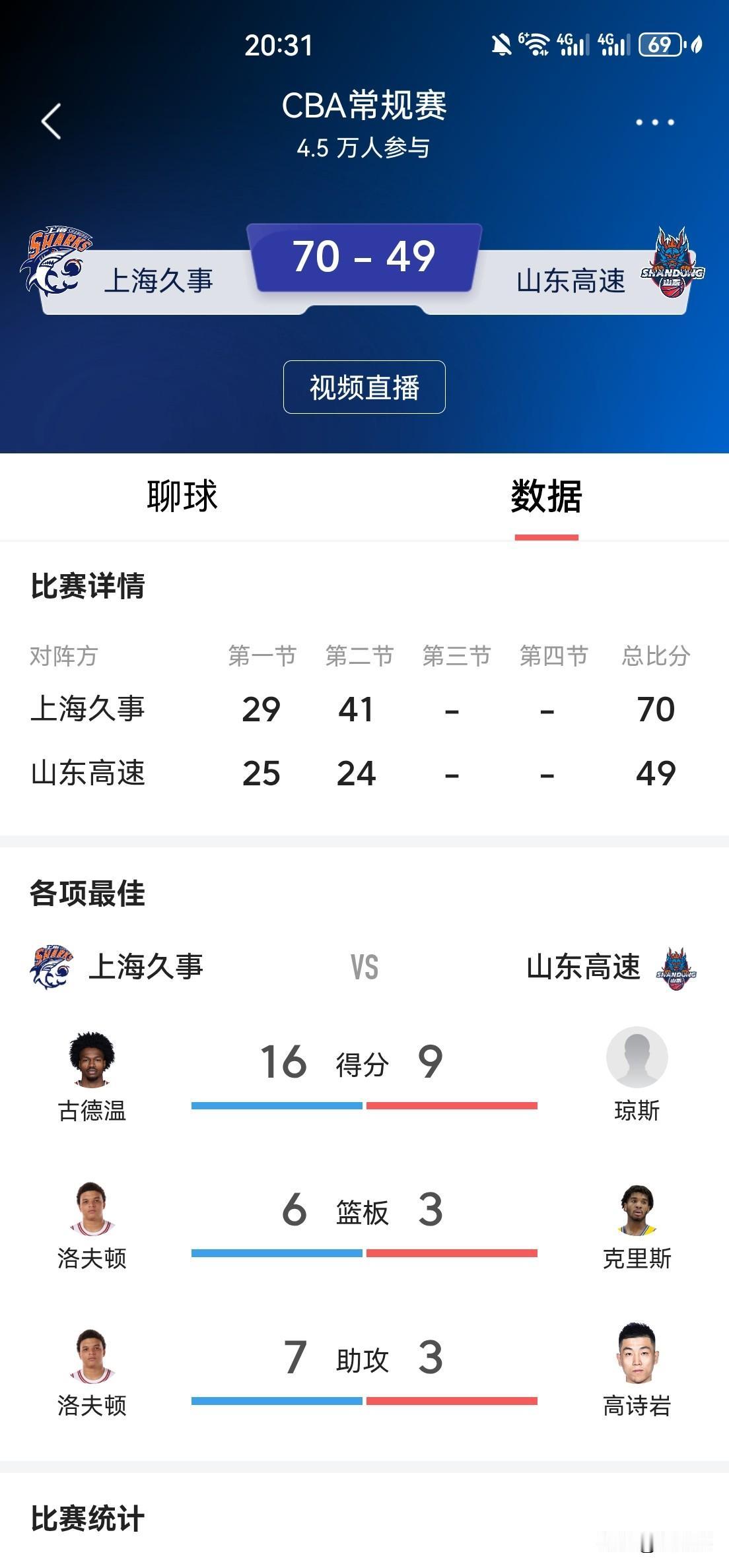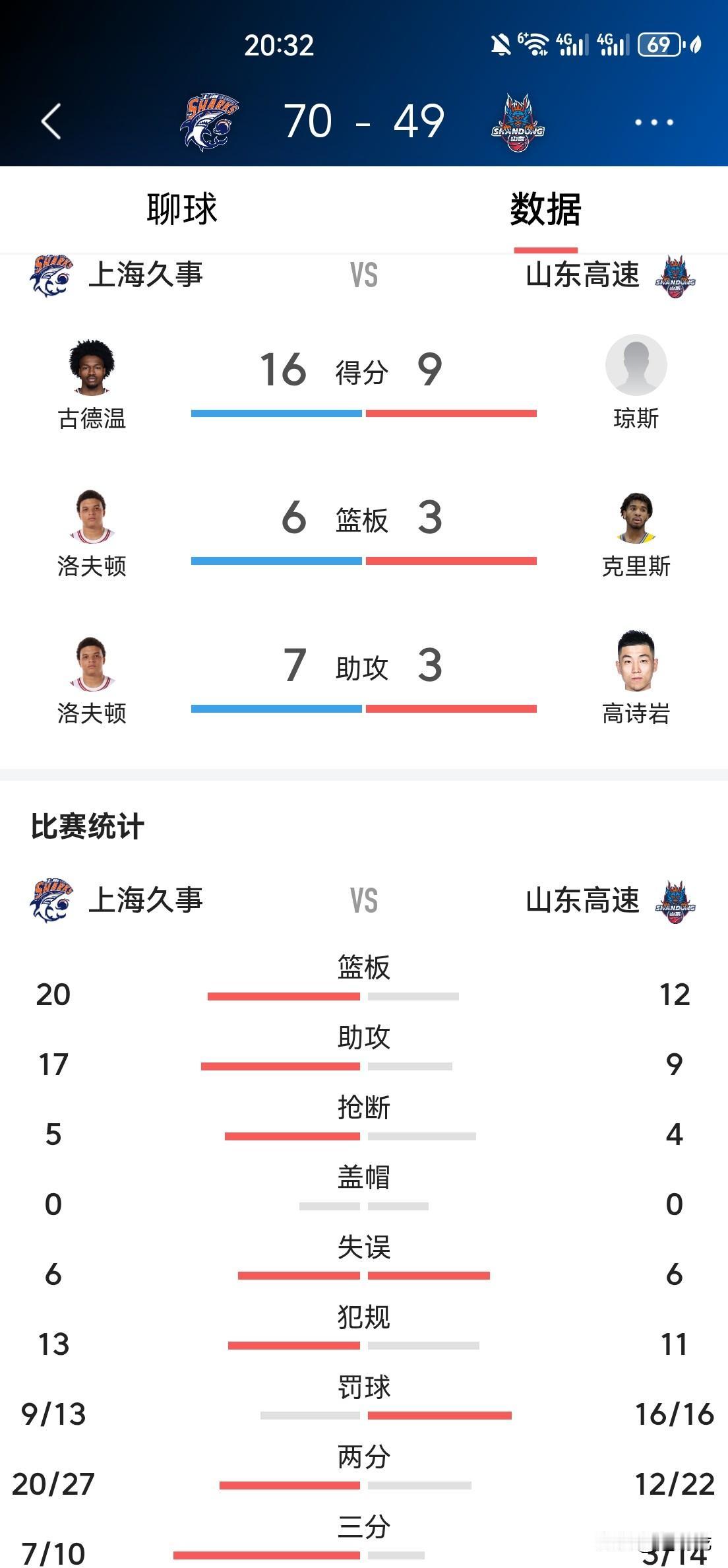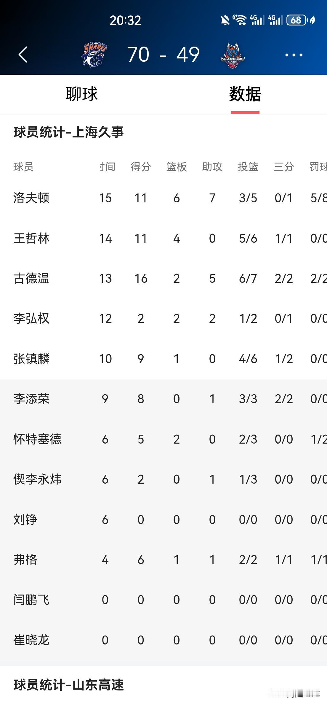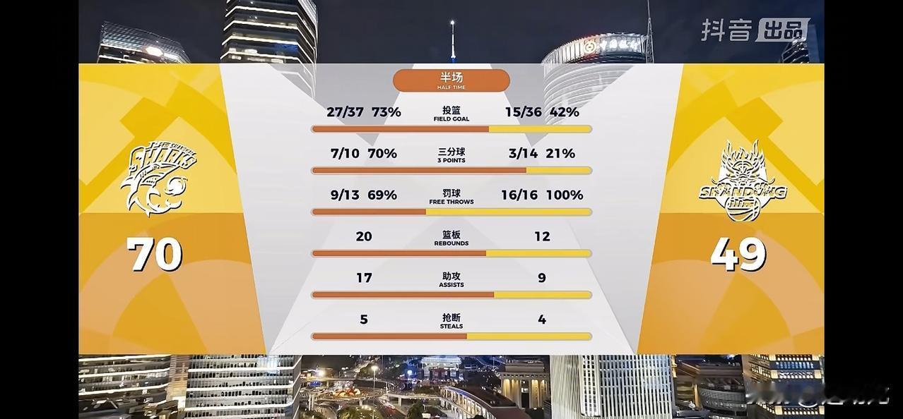 挡不住,挡不住!上海队打疯了! 半场就将排名榜第四位防守最强悍的山东队打崩溃了,70:49上海队领先山东队21分! 上海队半场砍下70分,37头27中命中率70%,三分球10投7中,命中率70%!古德温16分,洛夫顿11分,王哲林11分,10人出场9人得分入账。篮板球20:11,净胜9个,助攻数17:9,均胜出对手近一倍,攻防两端都完全压制住对手 上海队要打遍CBA无对手了吗?