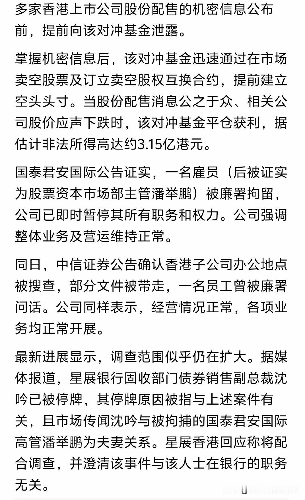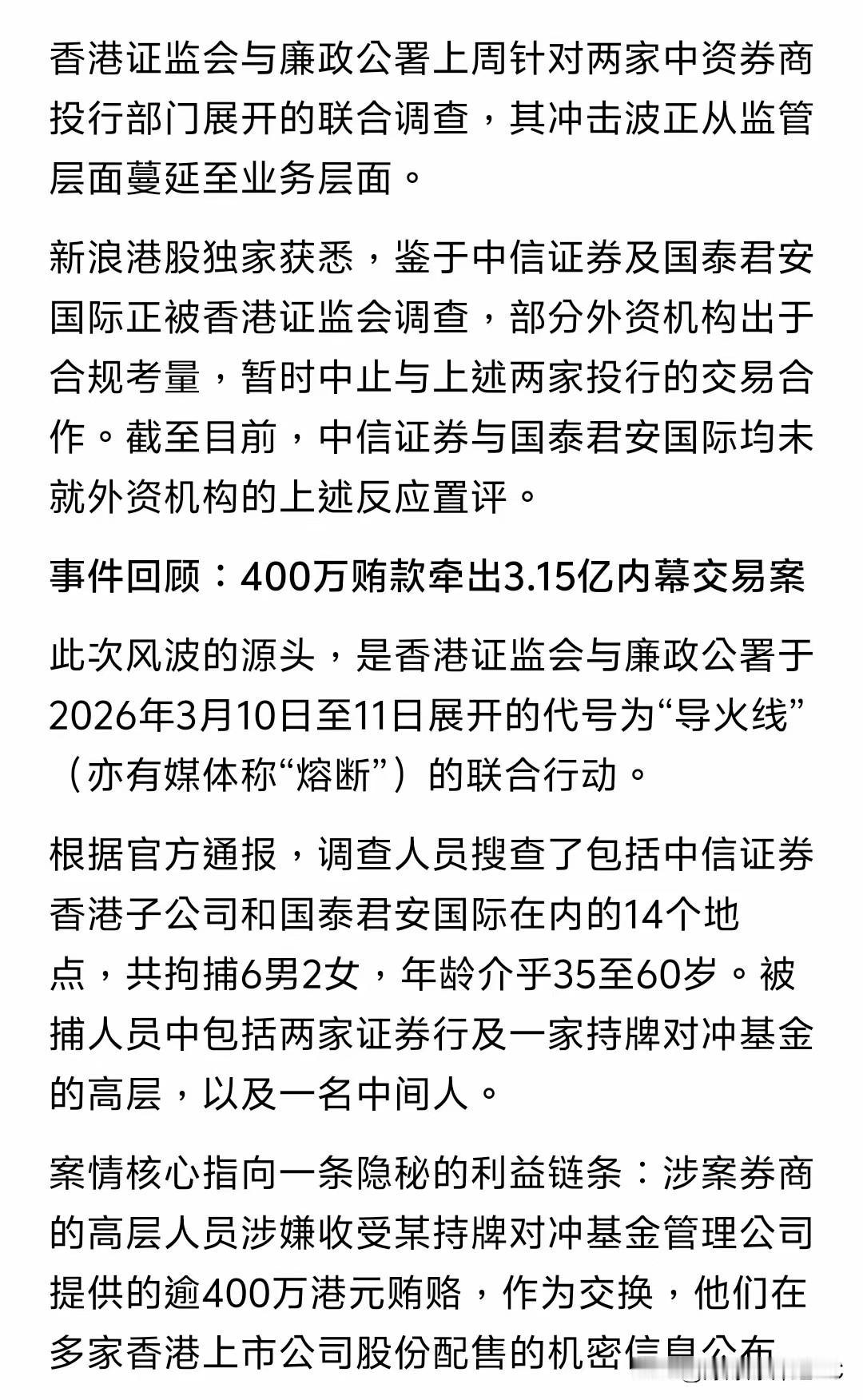 香港廉政公署这次抓人,后续的威力简直是一波接一波。 这几天看新闻,据说好几家外资机构直接就急眼了,果断按下了暂停键,中断了跟中信证券还有国泰君安国际的交易合作。 我觉得这下咱们可算是看清了,什么叫丢人丢到外面去。自己人在里头搞“内幕交易”,毫无底线地吃里扒外。连人家外资都觉得这种玩法吃相太难看,生怕惹一身腥,赶紧撇清关系。 平时国内那帮小散户在股市里天天亏钱,感情全是因为有人在背后玩这种见不得光的脏套路。人家是既当裁判又当运动员。 现在廉政公署的调查还在往深了挖,牵扯进去的人员眼看着还在不停增加。 接下来就看这摊子浑水底下,到底还能揪出多少装模作样的“金融精英”了。