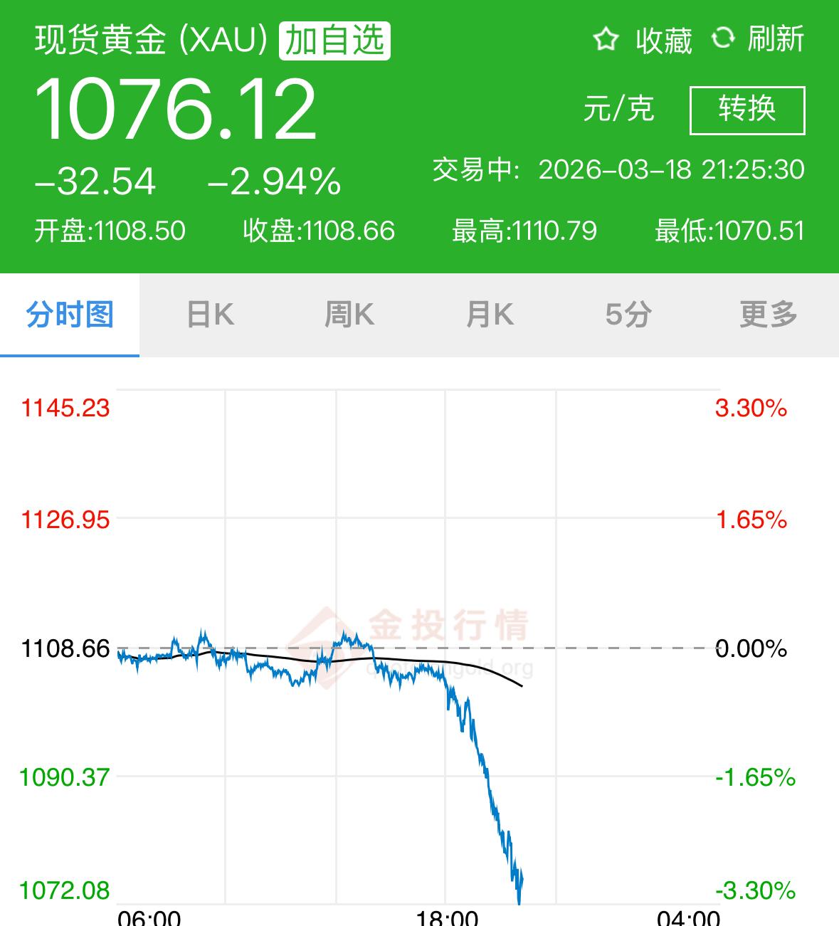 金价大跌!3月18日晚21时,黄金价格直线跳水!国际金价每盎司下跌147美元,跌幅3%。国内金价1080元,跌幅2.74%,每克跌走30元!国际金价要跌回4800吗? 最新显示国际现货黄金4860美元/盎司,国内金价1076元/克。