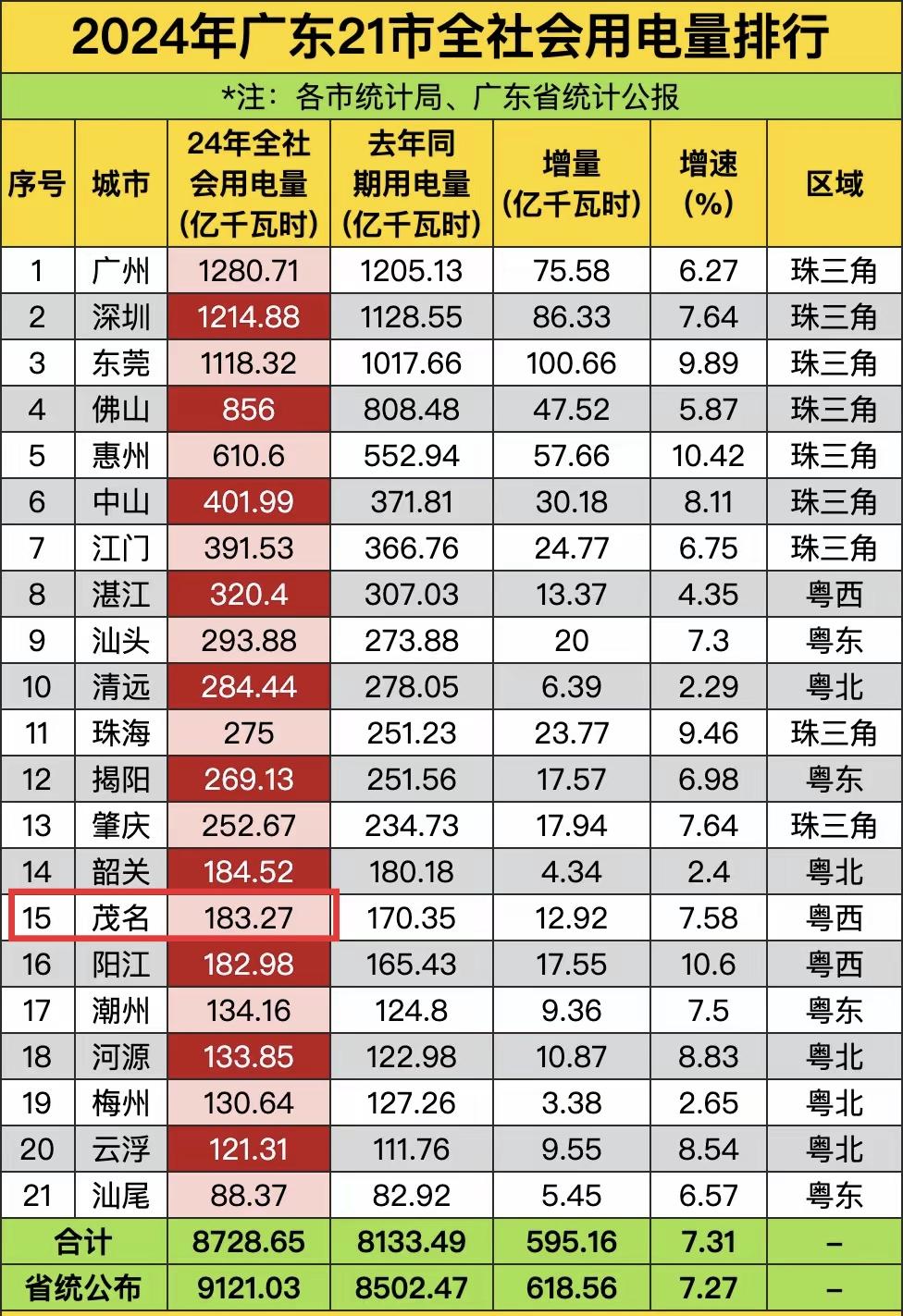 茂名GDP超过4000亿,排名广东第九,但是用电量却不多,只排全省第十五。这里就