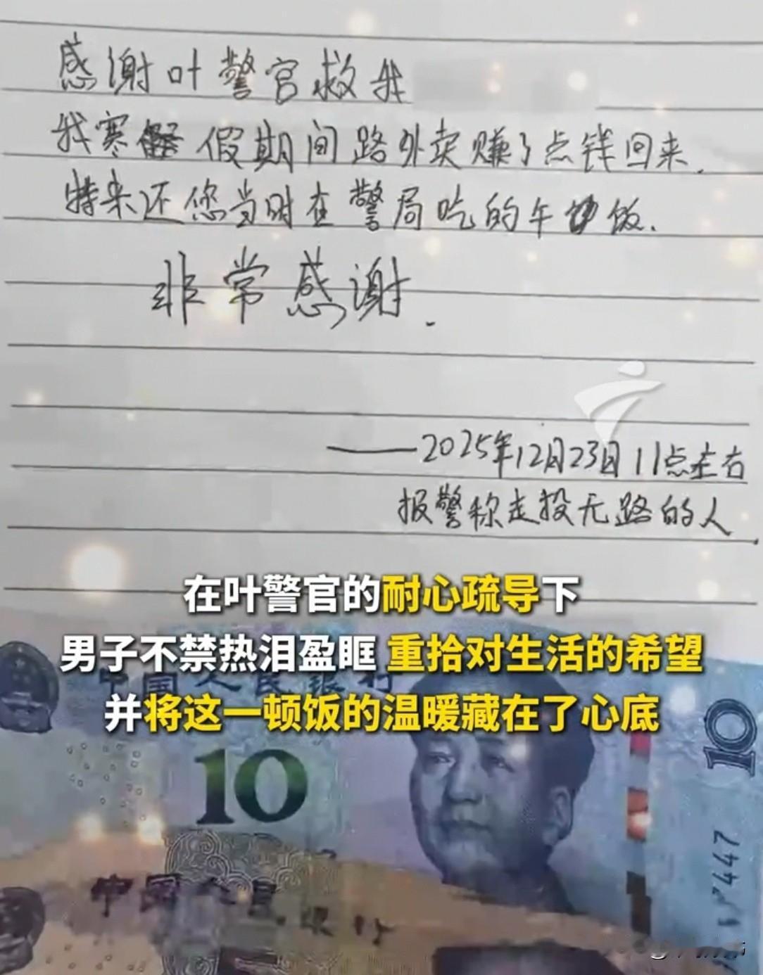 广东一男子向民警求助,民警自掏腰包,请他吃了顿饭。3个月后,男子再次出现,民警心里顿时“咯噔”了一下。谁知,男子却递给民警一样东西。民警看后,瞬间红了脸。 2025年12月,一男子因为遭遇车祸,身上一分钱都没有,走投无路之下,他情绪低落地走进派出所求助。 见到民警后,他忍不住说出自己的困境:“我现在身上连30块钱都拿不出来。” 民警看出他又饿又无助,耐心地安慰开导他:“你就是一时过不去这个坎,别灰心,我先请你吃顿饭。”说完,民警就自己掏钱,带男子吃了一顿热乎的午饭。 这顿饭不大,却让绝望中的男子感受到了温暖,也慢慢平复了情绪,重新燃起了生活的希望。 从那以后,民警就再也没有见过这名男子。他心里想着,对方应该已经慢慢走出困境,重新开始好好生活了,也就没有再放在心上。 可谁也没想到,三个月后,这名男子竟然又出现在了派出所。 民警第一眼看到他时,心里还“咯噔”一下,以为他又遇到了什么难处。 可这次,男子脸上没有一丝低落,反而满脸笑容,一见到民警就热情地走上前,把手里攥着的东西递了过去。 民警接过一看,瞬间就红了脸。 原来,里面是一封亲手写的感谢信,还有15块钱。 男子告诉民警,这段时间他靠打寒假工、送外卖挣了钱,这次专门过来,就是为了还上当时那顿午饭钱。 他在信里真诚地写道,非常感谢民警当初的帮助,那顿饭不仅填饱了肚子,更让他重新振作起来。 民警一顿热饭,暖了落难男子的绝境;小伙打工还钱、手写感谢信,守住了最真的感恩。没有惊天动地,只有朴素的善意与回报。 小小一餐饭,藏着人间最暖的温柔,善良有回应,真心换真心,这才是最动人的烟火温情。
