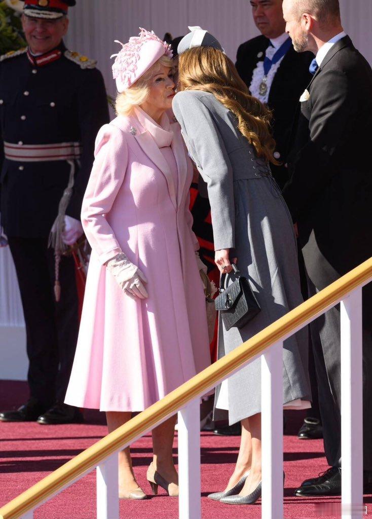 卡米拉王后和威尔士王妃凯瑟琳贴面礼婆媳两人看着挺和谐。