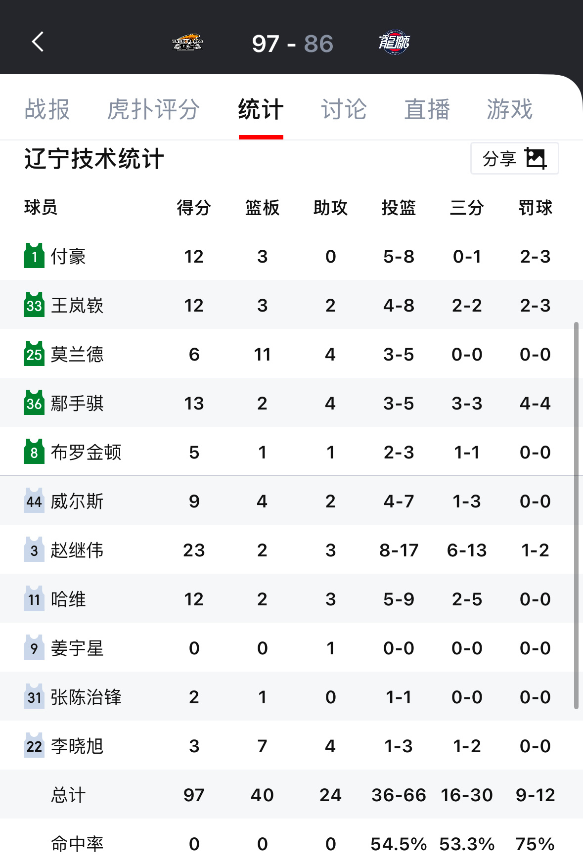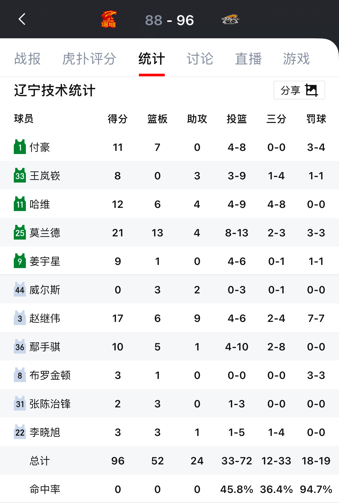 辽宁队第二阶段开始后的这四场比赛三分命中率分别为:36.4%,31.8%,39.3%,53.3%命中个数分别为:12个,7个,11个,16个