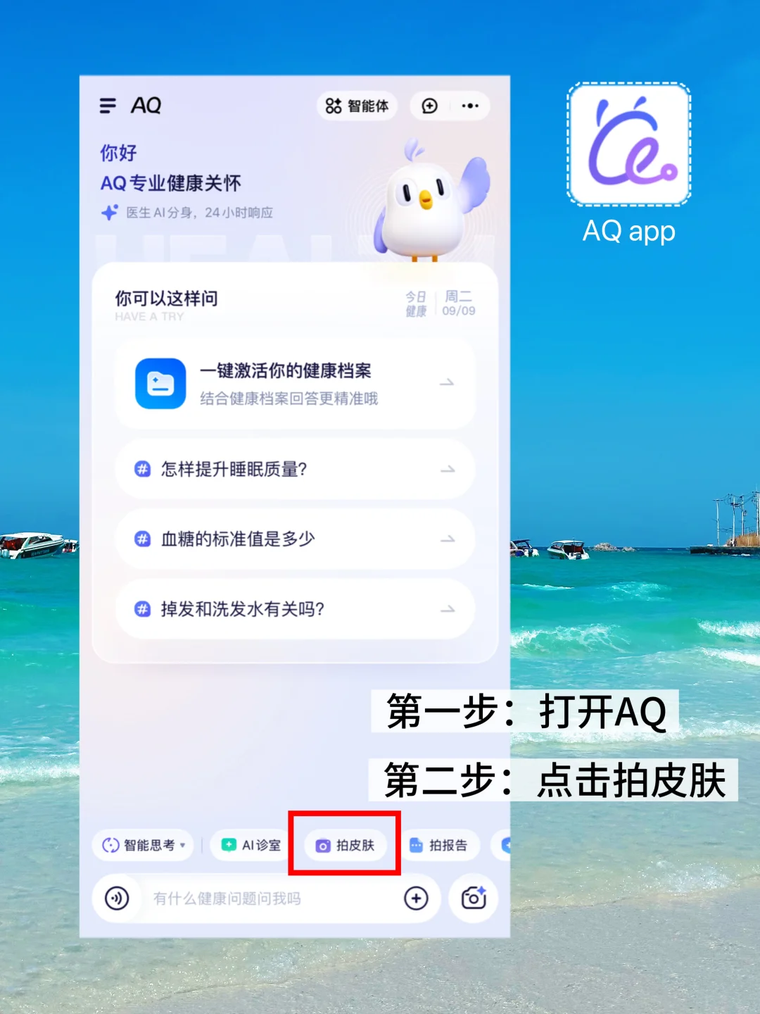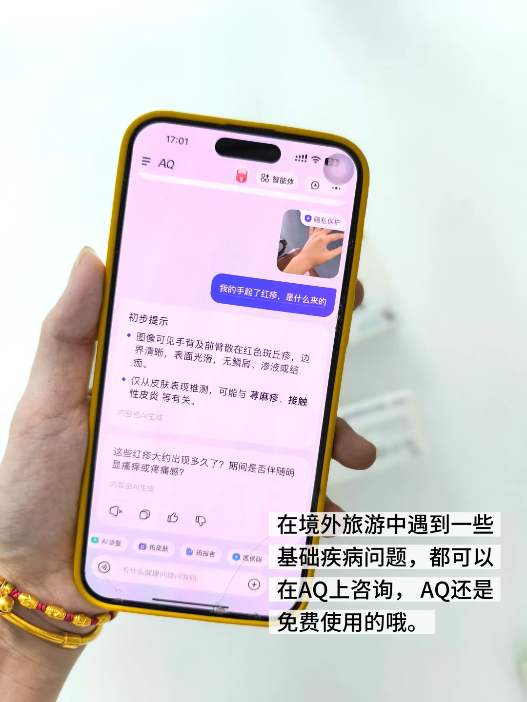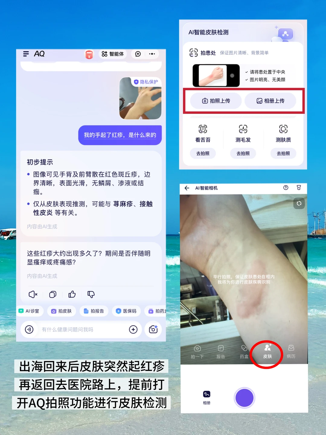 ❗️享受阳光、沙滩、美食的同时,对肌肤也是满满诱惑,湿热天气+强紫外线,隐藏着很多肌肤敏感的陷阱,出海玩了一圈暴晒后,我的皮肤有点起红疹,不知道可以自行用药还是应该就诊,毕竟境外旅途中就医不像国内那么方便,朋友说AQ app,里面有拍照皮肤检测功能。我马上下载AQ app对着自己的红疹处拍照进行皮肤检测。AQ很快分析给出健康建议。原来这红疹是过敏性荨麻疹,我可以安心继续接下来的行程了。
